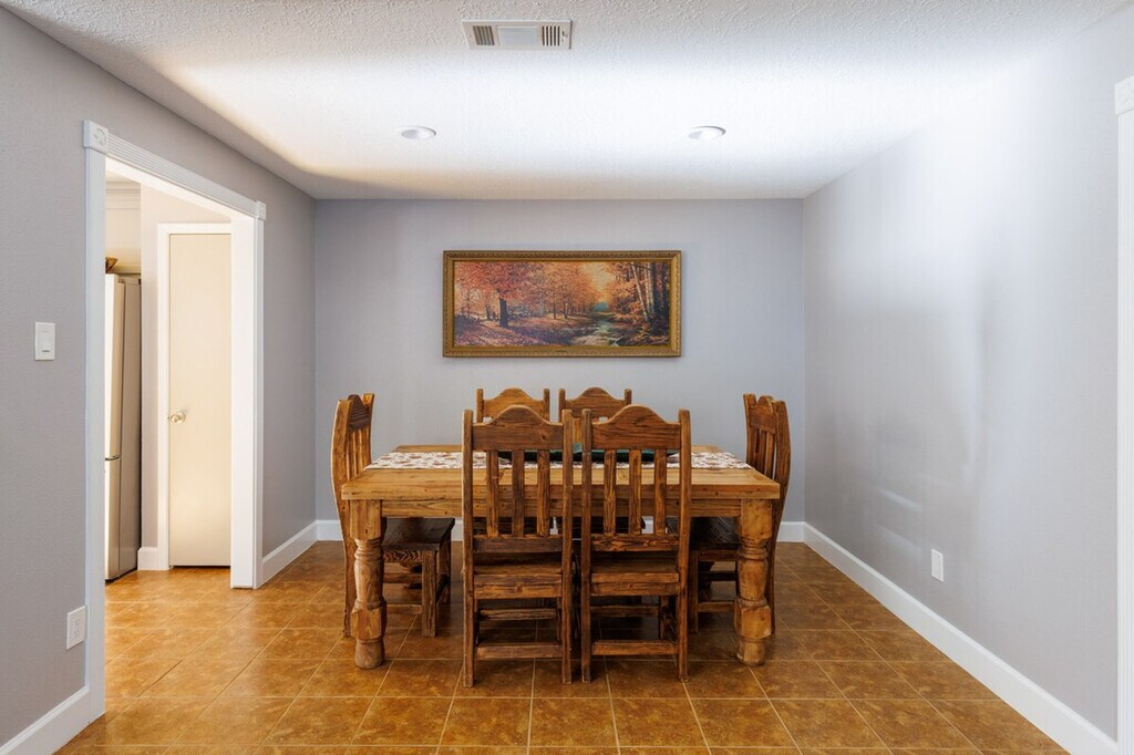 Feel at home in this peaceful, secluded family getaway located in a quiet Houston neighborhood. This home is ideally located and perfect for large groups, families, traveling, and working crews. This property features a well-stocked kitchen, fireplace, TVs, and fast internet speed. The master bedroom has a bathroom equipped with a shower. There is also a bathroom in the main hallway with a shower, and a third bathroom outside for use while lounging around the saltwater pool. The living room is large with two couches. Seating around the dining table fits six people comfortably, and there is plenty of bar room as well. This property has three bedrooms: a master bedroom with a king-size bed, a full-size bedroom, and a room with a double twin bunkbed and a twin over queen bunkbed. Located in a tranquil neighborhood, this home offers a vibey outdoor space and plenty of spacious room. Smoking is not allowed inside, and glitter is prohibited. If smoking outdoors, all cigarette butts must be picked up, or an extra cleaning fee will be assessed. Includes a dedicated work desk. [SI]