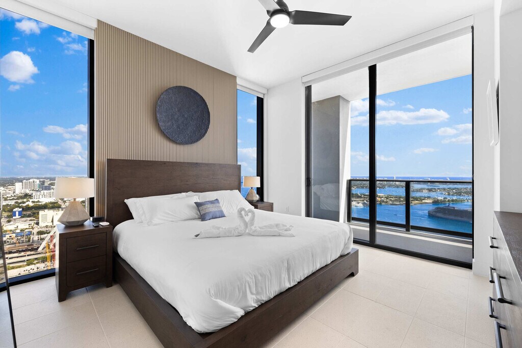 Elevate your stay in this spectacular 3-bedroom penthouse, perched high above Downtown Miami. With soaring ceilings, elegant design, and floor-to-ceiling windows, this apartment creates a sense of space and sophistication. Enjoy breathtaking panoramic views of Biscayne Bay and the city skyline from every room, and feel at home whether you're relaxing in the expansive living area or waking up to sunrise views. Enjoy luxury and comfort in this 3-bedroom apartment in downtown Miami. The master bedroom features a king-size bed, TV, private balcony, and en-suite bathroom for your own peaceful retreat. The second bedroom offers a cozy queen bed with a TV and lots of natural light, while the third bedroom includes two twin beds and a TV, great for kids or extra guests. The spacious living room includes a king-size sofa bed, big TV, and dining table for six people. The fully equipped kitchen boasts modern appliances, including a Wolf stove, SubZero fridge, and coffee machine, providing all you need to cook. Elegant bathrooms with luxury fixtures, walk-in showers, and premium toiletries offer a refreshing experience. High-speed Wi-Fi keeps you connected for work or fun. Guests can enjoy the convenience of free parking located just a short walk from the building, ideal for easy access without additional costs. Valet parking is available with rates of $43 for 0-4 hours and $75 for 4-24 hours, with an additional $15 fee for oversized vehicles. Spa and wellness services are available at an additional cost. A daily resort fee of $37.45 applies and must be paid at the front desk during check-in, with only credit card payments accepted. This apartment offers walkable access to Miami’s top attractions. Bayside Marketplace is just 0.3 miles away, offering shopping, waterfront dining, and live entertainment. Bayfront Park, also 0.3 miles away, is a scenic spot for yoga, food festivals, and major events like the Ultra Music Festival. The Kaseya Center, home of the Miami Heat and a venue for concerts and performances, is 0.4 miles away. Museum Park, 0.5 miles away, features the Pérez Art Museum and the Frost Science Museum. PortMiami is just 1 mile away, ideal for pre- or post-cruise stays. Brickell, Miami’s sleek financial district, is 1.5 miles away, filled with fine dining, rooftop bars, and luxury shopping. South Beach is a quick ride, just 5 miles away, offering white-sand beaches, iconic Art Deco streets, and nonstop nightlife. The Miami Worldcenter, Adrienne Arsht Center, and Miami Convention Center are also nearby, making this location unbeatable for experiencing the ultimate Miami lifestyle. Check-in is available until 12 AM, with an early check-in option subject to availability and an additional fee. The property is smoke-free, with smoking strictly prohibited inside the unit and on the balcony, and violations may result in severe fines. Quiet hours are from 10:00 PM to 8:00 AM. All guests must be registered, with full names and IDs provided at check-in. Reservations must be made by someone 21 years or older, and the reservation holder must be present throughout the stay. Standard check-in is at 4:00 PM, and check-out is at 11:00 AM. Late check-out until 12:00 PM is available for an additional $50, subject to availability. Damages to the apartment will result in additional charges. The apartment is equipped with high-speed Wi-Fi, making it easy to stay connected for work or fun. [SI]