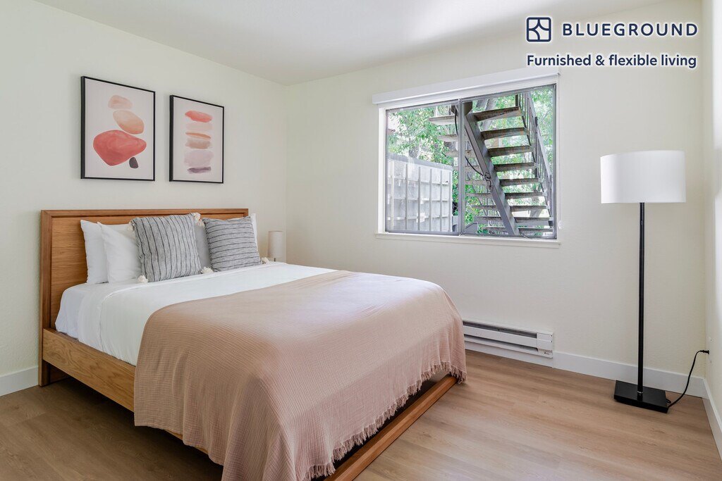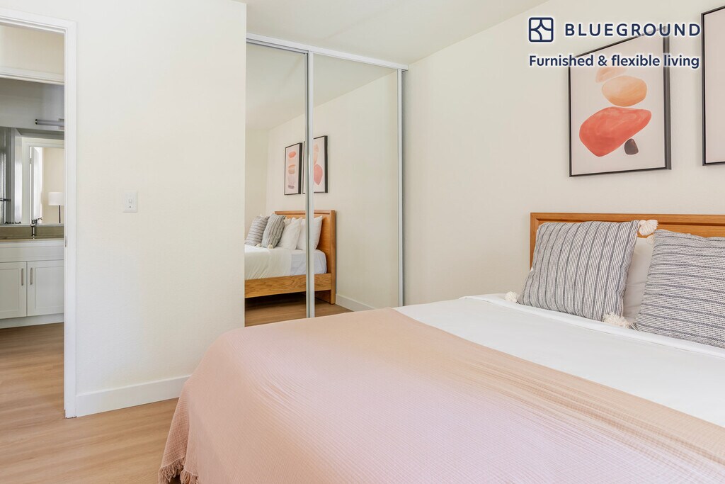 Feel at home wherever you choose to live with Blueground. You’ll love this spacious Shoreline West furnished two bedroom apartment with its modern decor, fully equipped kitchen, and bright living room. Ideally located, you’re close to all the best that Mountain View has to offer! (ID #SFO1858) The advertised rate of $4,290/month is the lowest available price, based on a 2 month(s) and 29 day(s) stay with a move-in date of November 7, 2025. If you’re looking for a 1-year stay, the rate is $5,180/month. Rates vary depending on the duration of stay, season, and other parameters. For exact pricing and additional pricing components, please visit our website and enter your desired move-in and move-out dates. The rate is applicable when billed upfront; it can be higher if billed in multiple payments. Brokers are welcome to reach out. Were you looking for an unfurnished lease? Try Blueground instead and upgrade from unfurnished to furnished living: - Furnished at rates comparable to unfurnished - No setup or furniture costs - save thousands - Move-in ready - save time, just bring your suitcase Designed with you in mind Thoughtfully designed with bespoke finishes, modern furnishings, and a fully equipped kitchen, you’ll enjoy that “I’m home” feeling with this Blueground apartment. Whether you’re lounging in your beautiful living room streaming the latest and greatest entertainment on the smart TV or premium wireless speaker, or getting some well-earned rest on the superior quality mattress with luxury linens, you’ll fall in love with everything this Shoreline West apartment has to offer. This apartment also offers in-apartment laundry. Sleeping arrangements King Bed, 70.8in/180cm Queen Bed, 63in/160cm Amenities Building amenities unique to this two bedroom apartment include an on-site: - BBQ Area - Dryer - Swimming pool - Washing machine - Parking - Pets allowed Arrival and ongoing support The entire apartment is yours to enjoy! Throughout your stay, you’ll have access to our Client Experience team through the Blueground App. You can schedule additional cleanings, submit maintenance requests, and view our neighborhood recommendations with just a few taps. We’ll share all details upon confirmation of your stay. Other things to note Building amenities may have an extra cost. This Blueground apartment has flexible lease options, allowing you to book it for one month, a year, or more. Pets are welcome, though weight limits and breed restrictions apply and may incur fees. Parking is offered based on availability and is subject to a fee. Please keep in mind that this is a walk up building. We take great pride in ensuring every photo displayed is shot in our own units with our actual furnishings. That said, we regularly refresh our decor and furniture arrangement, which may differ from what’s pictured. Also note - There are stairs leading up to the entrance of this apartment, but no elevator [SI]