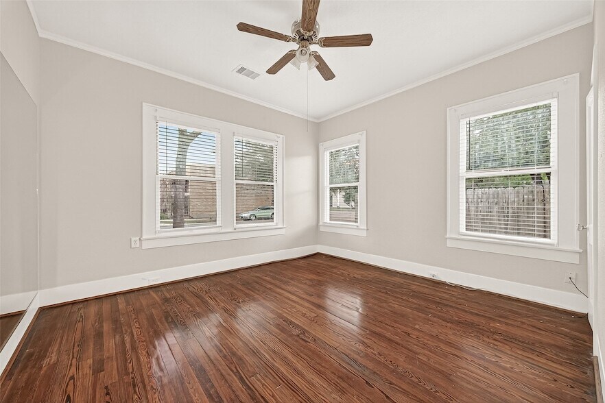 Amazing location! Walking distance from University of St. Thomas, the Menil Collection, Rothko Chapel and great restaurants! This 2 bedroom 1 bath bungalow has old style charm with a welcoming front porch, simple kitchen with butler's pantry, breakfast room and classic wood floors. There are 2 living spaces that can be used for formals, family room and study, game room, sitting room or whatever meets your needs. Updated stylish bathroom splits the two bedrooms. Home has some valuable side perks of having Google Fiber connectivity, whole house generator, and new HVAC system. Can be mostly furnished if needed meaning moving is simple and easy. Comes with refrigerator, new washer, new dryer and can also include desks, couches, table and more (see inventory list).