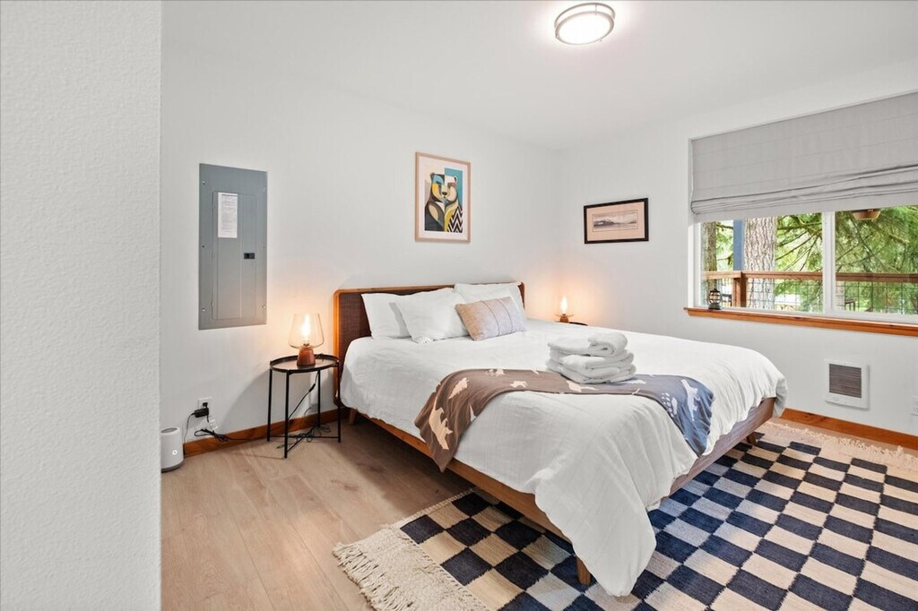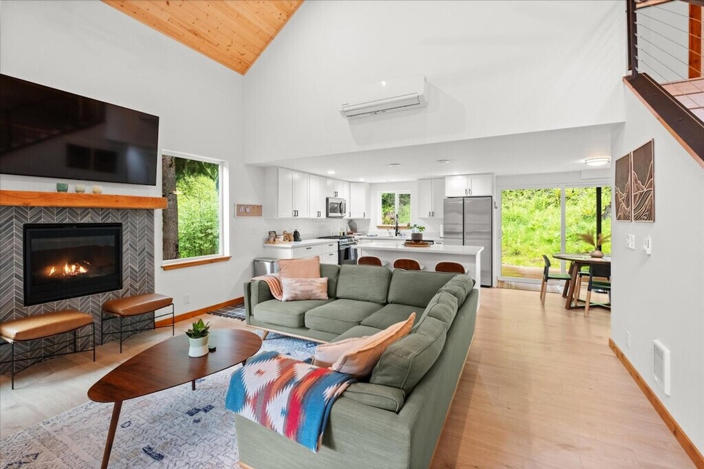 Experience the tranquility of the countryside in this new 3-bedroom, 2-bathroom home, offering 1,488 sqft of living space. Feel at home in this two-level home, with a few steps to the entrance door. This spacious retreat features a backyard equipped with a BBQ grill, fire pit, and hot tub, perfect for relaxing after a day of adventure. The fully stocked kitchen includes a coffee maker, dinnerware, silverware, drinkware, cookware, and servingware. Enjoy the convenience of an on-site washer and dryer, a mini-split for cooling on the main floor, a fireplace, smart TV, and internet for streaming. There is also a front porch and covered backyard deck for year-round outdoor relaxation. Well-trained pets are welcome at $50 per pet per night. Located just 8 minutes from the entrance to Mt. Rainier National Park, this home provides access to excellent hiking trails and diverse outdoor activities. Paradise Estates is a mix of full-time residents, vacation homes, and other rental properties in a private community approximately 5 miles from the Nisqually entrance of Mt. Rainier National Park. The cabin is accessed by fully maintained roads all year round and is only accessible by car. Four-wheel drive is recommended in the winter. Parties and events are strictly prohibited, quiet hours are between 10pm and 8am, smoking or vaping of any kind is prohibited anywhere on the property including outdoor areas, digital piracy is prohibited, and shoes are not allowed in the home. There is a $500 fine per violation. The use of the fire pit and charcoal grill are prohibited during burn bans. [SI]