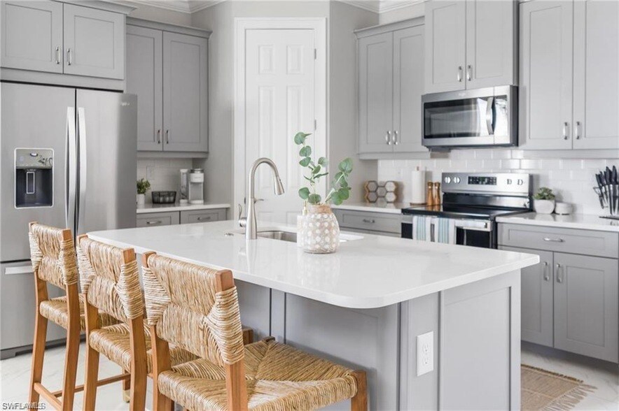 Coastal Modern Turnkey FURNISHED and PET FRIENDLY!!! Available August-Sept 2025 and May-December 2026 at $4000/mo, which includes internet and all utilities ($150/mo electric cap). 2 bedrooms plus a den to sleep up to 6 people! King sized bed and TV in Primary Suite with dual vanity sink and large walk in closet. The Guest Bedroom features a Queen sized bed and the den offers a sofa sleeper, plus a desk if you have to connect with the office. Screened lanai with outdoor dining set and grill. Large 2.5 car tandem garage for extra storage. Spend your days at the resort style amenity center enjoying the lagoon style pool, work up a sweat at the fitness center or meet up with some new friends at the tennis, pickle ball or bocce courts! Take an afternoon walk with your dog to the dog park and enjoy a sunset dinner on your back patio! Also just minutes to several famous Bonita Springs Golf Courses, the hot new Downtown Bonita and Riverside Park for dining and entertainment, Bonita Beach and all the fun Southwest Florida has to offer! Don t miss out on this one! Owners are also listing agents.