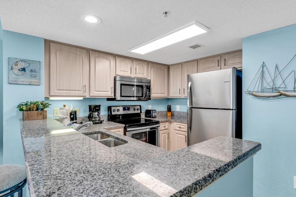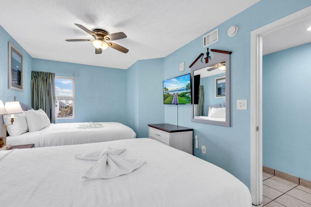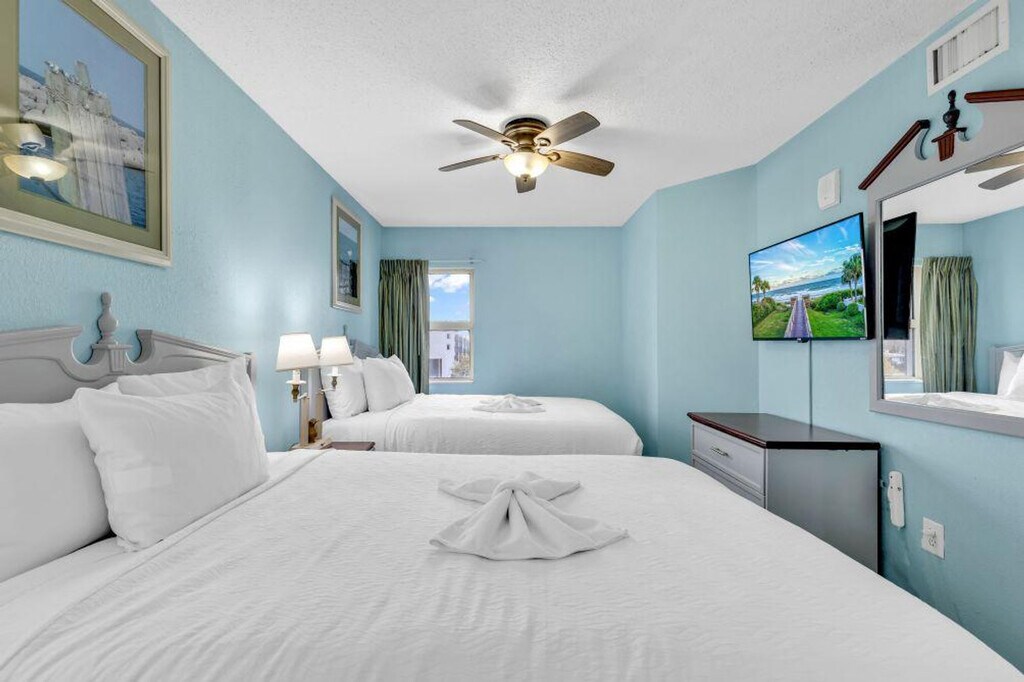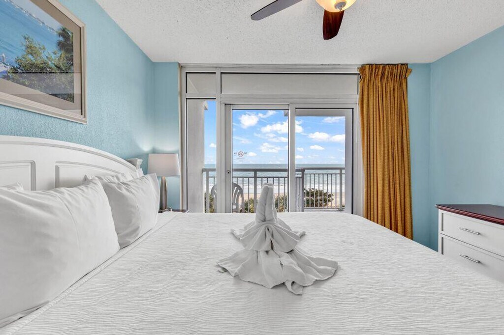 Escape to a breathtaking 2-bedroom beachfront condo at a beautiful resort, where stunning ocean views and unforgettable sunrises and sunsets are just a step away from your private balcony. Experience the perfect blend of relaxation and adventure as you start your day with a refreshing dip in the pool or a stroll on the beach. Located in the heart of Myrtle Beach, the condo is just steps away from all the major attractions, shopping, and dining experiences that the area has to offer. You'll be just a few blocks from the famous Myrtle Beach Boardwalk, Sky Wheel, and Pier, making it the ultimate vacation destination for those looking for the ultimate beach getaway. This condo features a private balcony with waterfront views and a fully furnished kitchen with major appliances and cookware. Enjoy free Wi-Fi, TV, and other in-unit entertainment options in this family-friendly resort. Relax in the tranquil oceanfront pool, 150 ft. long Lazy River, outdoor hot tub spa, kiddie pool, and indoor pool with hot tub. Free parking is available for 2 cars. Parking lots are located on Withers Street parallel to Ocean Blvd. and one street over from the resort. Located centrally on Ocean Boulevard in Myrtle Beach, this condo is close to the strip, blocks away from the Boardwalk, and near boutiques and souvenir shops. It's just a short drive to the Sky Wheel and Ripley's Believe it or Not Museum. Coastline Pest Control performs mandatory preventative treatments in every unit on the 3rd Friday of each month. In case guests fail to leave bracelets in the unit, they will be charged an extra $25 per item for replacement. Grilling is prohibited and any violation of this policy will incur a $200 fine. Bicycles, motorcycles, mopeds, and trailers are not allowed. No smoking in the unit or on the balcony, with any violation incurring a $250 fine plus cleaning costs. No pets allowed, with any violation incurring a $200 fine. Gatherings of more than 6 people including both overnight guests and visitors are not allowed and may be subject to eviction. House parties and illegal substances are strictly prohibited and grounds for immediate eviction. You must be at least 21 years old to book this property. Leaving the unit later than the check-out time will incur a late check-out penalty starting from $500. For same day late check-ins, you need to get the host's approval before booking. Upgraded internet with 200mbs/20mbs speed is perfect for working from the beach. A laptop computer is not included. [SI]