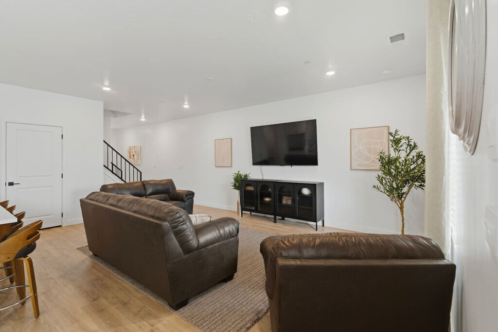 Feel at home in this Southern Utah home, perfect for families, friends, and group getaways. This spacious retreat features four private bedrooms, each with an en-suite bathroom and TV. This home comfortably accommodates large groups. The main floor features a welcoming entryway that opens to a bright living room with a 75-inch television, a fully equipped kitchen, and a dining area designed for gathering. A cozy secondary living space is perfect for kids, game nights, or quiet downtime. The upstairs laundry room makes longer stays easy and stress-free. Guests enjoy access to a community pool with shade and loungers, a game room, pickleball courts, cornhole, outdoor ping pong, walking paths, and shared spaces. Parking is available for 2 cars in the driveway and 2 cars in the garage. Overflow parking is located in small community lots at the end of each block. Zion National Park is just 39 miles away. Quail Creek State Park and Sand Hollow State Park are 13 miles away, offering boating, fishing, watersports, and off-road adventures. Snow Canyon State Park, with hiking, red rock views, and trails, is 19 miles away. Nearby St. George Golf Courses include Green Spring Golf Course and Coral Canyon Golf Course (7 miles), Southgate Golf Club (11 miles), Sky Mountain Golf Course (13 miles), Sunbrook Golf Club (14 miles), and The Ledges of St. George (17 miles). Daytime construction noise may be present nearby, approximately 8:00 AM–5:00 PM. No smoking or vaping is allowed on the premises. A $200 per day fee will be assessed for each day of the reservation if it is found that guests have been smoking or vaping on the premises. If the property IS pet friendly, pets are allowed at the property at the cost of $10 per pet, per day. Emotional Support animals fall under this requirement as they do not have the same rights as Service Animals under the ADA. If the property IS NOT pet friendly, no animals are permitted at the property. For unauthorized pets, a $250 fee will be assessed. Quiet hours begin at 10:00 PM each night and continue until sunrise. Moving furniture is not allowed. A $500 fee will be assessed if the cleaners have to move furniture to reset the property for the next guest. A $200 per day fee will be assessed for each day of the reservation if it is found that guests have been smoking or vaping on the premises. A $30 fee, per bin, will be assessed for unbagged garbage found in the bins. [SI]