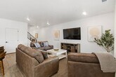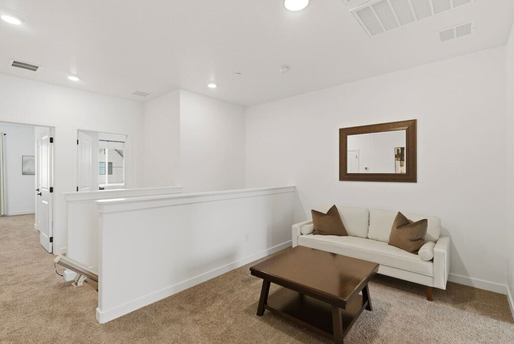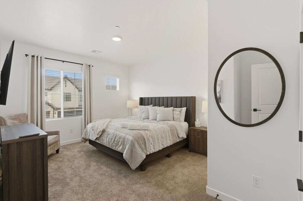 Feel at home in this spacious Southern Utah retreat, ideal for families and group trips. This home features four private bedrooms, each with its own en-suite bathroom and TV. The main floor features a welcoming entryway that opens into the living space with vaulted ceilings and a 75-inch television, a fully equipped kitchen, and a dining area designed for gathering. Upstairs, all four bedrooms are conveniently located, each featuring a private full bathroom. The cozy upstairs secondary living area is ideal for kids, family game nights, or quiet relaxation. An upstairs laundry room adds extra convenience for extended stays, business travelers, and road trip guests. A stairlift is installed on the main staircase to assist guests who may need support accessing the upstairs bedrooms. Traveling with a larger group? This trusted partner manages a rare collection of 5 nearby homes, allowing everyone to stay close while still enjoying their own space. Pets are welcome at the cost of $10 per pet, per day. Enjoy shared community amenities including a pool, pickleball courts, cornhole, and ping pong. Quail Creek State Park and Sand Hollow State Park for boating, fishing, watersports, and off-road adventure are 13 miles away. Snow Canyon State Park with hiking, red rock views, and trails is 19 miles away. Zion National Park, world-famous for stunning canyons and scenic drives, is 39 miles away. Nearby St. George Golf Courses include Green Spring Golf Course & Coral Canyon Golf Course (7 miles), Southgate Golf Club (11 miles), Sky Mountain Golf Course (13 miles), Sunbrook Golf Club (14 miles), and The Ledges of St. George (17 miles). No smoking or vaping is allowed on the premises. A $200 per day fee will be assessed for each day of the reservation if it is found that guests have been smoking or vaping on the premises. For unauthorized pets, a $250 fee will be assessed. Quiet hours begin at 10:00 PM each night and continue until sunrise. A $30 fee, per bin, will be assessed for unbagged garbage found in the bins. Guests enjoy access to fun, resort-style community amenities, including a community pool with shade and loungers, a game room, pickleball courts, cornhole, outdoor ping pong, walking paths and shared spaces. Two cars fit comfortably in the driveway. Street parking is not available in front of the homes. Overflow parking is located in small community lots at the end of each block. [SI]