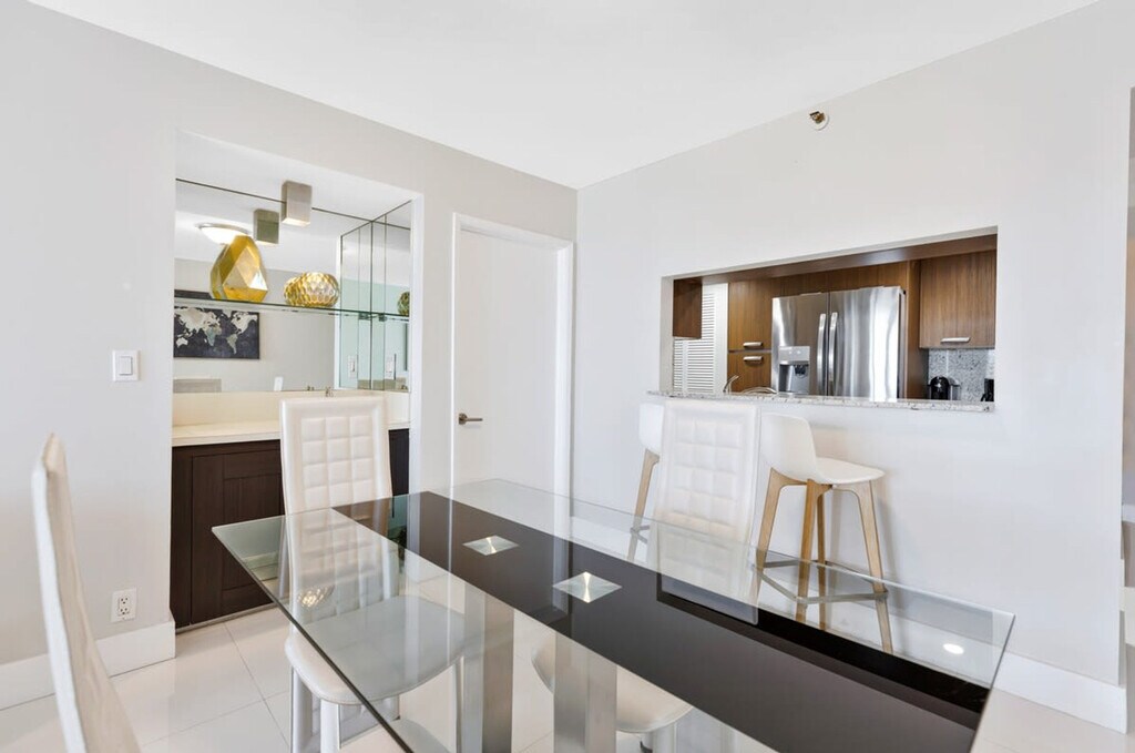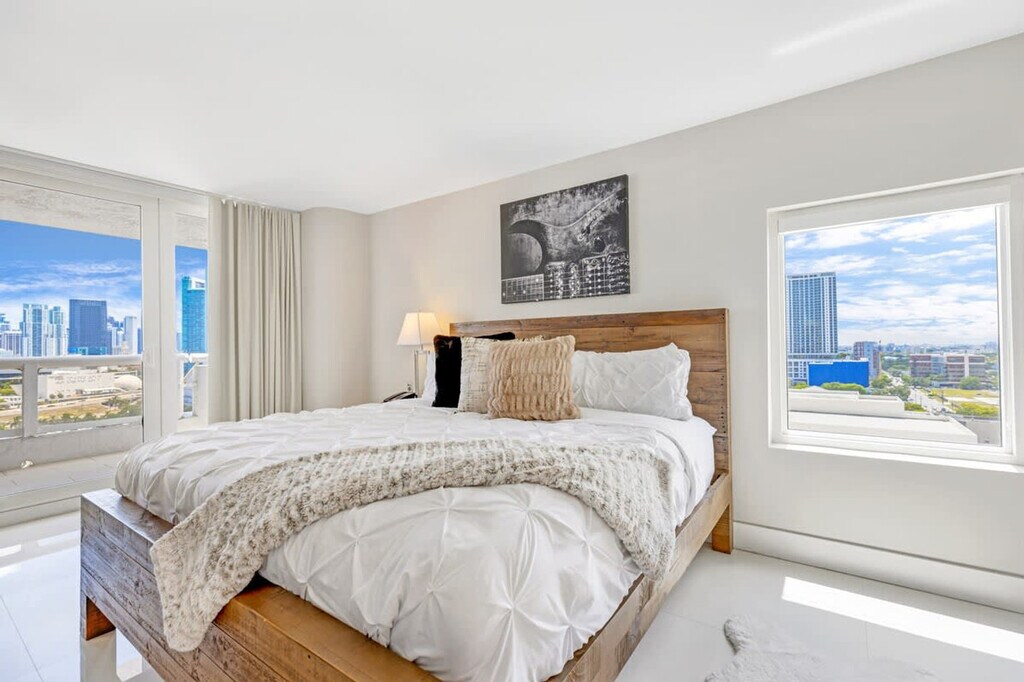 The advertised rate of $5,615/month is the lowest available price, based on a 1 month(s) stay with a move-in date of September 1, 2026. Rates vary depending on the duration of stay, season, and other parameters. For exact pricing and additional pricing components, please visit our website and enter your desired move-in and move-out dates. The rate is applicable when billed upfront; it can be higher if billed in multiple payments. Step into this 985 ft²/92 m² apartment and feel at home with stunning Biscayne Bay views and warm natural light. Located in The Grand, this centrally located apartment offers 1-bedroom and 1.5 bathrooms. This apartment features a private balcony, a dedicated workspace, and a fully equipped modern open-concept kitchen with sleek cabinetry and stainless steel appliances. Enjoy the convenience of an in-unit washer and dryer, streaming TV, and 400 Mbps Wi-Fi. Generous storage space and thoughtfully designed lounge and dining areas complete this apartment. Enjoy access to elevated amenities including a hot tub, pool, gym, sauna, on-site dining, luggage storage, and valet parking for a daily fee of $48. The valet parking garage enforces a height limit of 6'6", which accommodates most large SUVs but excludes trucks or vans. Vehicles like slingshots, motorcycles, and scooters/mopeds cannot be accommodated by the valet service, and no electric charging stations are available in the valet area. Located in Edgewater, this bayfront setting offers a residential atmosphere while remaining well connected to Miami’s key destinations and major venues. Wynwood is approximately 5–10 minutes away, known for street murals, creative spaces, restaurants, and bars. South Beach is approximately 15–20 minutes away, easily reached via the causeway, and known for its beaches, Art Deco architecture, and Ocean Drive. Miami Stadium is well connected from Edgewater via main roads and highways. Brickell City Centre is approximately 10–15 minutes away, a modern shopping and dining destination. Adrienne Arsht Center & Kaseya Center are approximately 5 minutes away, nearby venues hosting concerts, shows, and sporting events. The Design District is approximately 5–10 minutes away, home to luxury boutiques and acclaimed dining. Downtown Miami nightlife is approximately 5–10 minutes away, with a variety of bars, lounges, and entertainment spots. Building Management has strict occupancy rules of 2 adults only (16 years of age and older) plus 2 children. Smoking is only allowed on the balcony with all doors closed. If there is evidence of smoking indoors, a minimum $500 fine will be applied plus costs for odor removal and deep cleaning. Check-in time starts at 4 PM and late arrivals must be communicated immediately. Standard check-out time is 11 AM. Visitors are only permitted for reservations of 28 days or longer. For shorter stays, no visitors are allowed, and unregistered guests will result in immediate eviction without refund. The building is currently undergoing renovations that includes main lobby, pool and pool deck and other areas. Construction may cause moderate noise between 9 AM and 4 PM, Monday through Friday. The main lobby and front motor lobby are currently closed, though temporary pathways have been created for access. Residential elevators no longer stop at the main lobby, and service elevators must be used to reach the ground level. The residential pool is closed for repairs; however, the jacuzzi, pool deck, and solarium remain open. A full building application for residency may be required upon booking. Guests must be 21 years of age or older to make a reservation, in compliance with building regulations. After reserving the apartment, you are required to provide legible copies of government-issued IDs or passports for all adults aged 15 or older for building registration. Any missing remotes, streaming devices, or similar items will result in a charge of $100 per item. The Trash Room is located in the hallway near the elevator. Please place all recycling on the floor in front of the chute, and put bags with landfill waste down the trash chute. Trash must not be left in the hallway or outside the chute. Failure to comply may result in a $300 fine. The light-filled bedroom features a plush king-size bed and a dedicated workspace. [SI]
