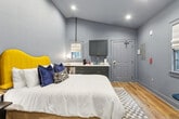 Welcome to The Music Room, a vibrant tribute to New Orleans' musical legacy, where you can feel at home. This room is one of 9 distinct units spread across three buildings, securely enclosed behind an iron entry gate. Each guest is provided with a personalized access code, and every unit boasts its own private exterior door entrance with keypad entry and daily access to the shared Lagniappe Lobby. This room features a Queen-size bed with stylish linens, a fully stocked kitchenette, and a full bathroom. A cozy seating nook with an armchair and side table offers a relaxing spot for reading or enjoying a drink. Vintage Jazz Fest posters and vinyl records add unique charm. The kitchenette includes a microwave, mini-fridge, sink, and Keurig coffee maker with pods. It is fully stocked with plates, bowls, cutlery, stemware, dish soap, and sponge. Additional amenities include high-speed internet, premium essential toiletries, an ironing board, steamer, luggage rack, and a Smart TV. This centrally located apartment is just steps from the N Rampart & Esplanade Streetcar stop, a two-block walk to the French Quarter, a four-block walk to Frenchmen Street, and offers direct access down Esplanade to the Fair Grounds. It is also within blocks of many Spring Festivals and all Mardi Gras has to offer. Smoking or vaping on the property, inside or outside, will result in a $250 cleaning fee and charges for any damages incurred. Pets are not allowed on the property, and bringing a pet will result in a $250-$500 cleaning fee and a request to leave. The minimum age required to make a reservation is 21. A state identification card or driver's license copy will be requested upon booking. [SI]