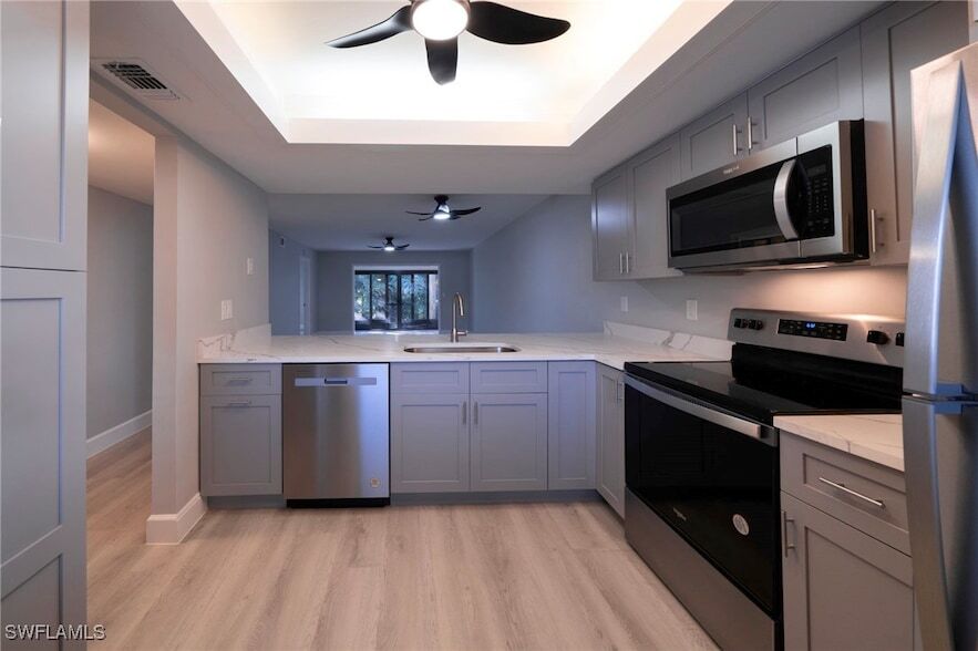 This spacious, fully renovated 2-bedroom, 2-bath residence perfectly blends modern style with a relaxed Florida lifestyle. The enclosed lanai has been incorporated into the living space under air, creating a bright and inviting area that overlooks lush, tropical landscaping ideal for enjoying peaceful mornings or relaxing evenings. A private open courtyard off one of the bedrooms provides an additional outdoor retreat.The kitchen is a true highlight, featuring quartz countertops, a large island, gray soft-close cabinetry, stainless steel appliances, and extra pantry storage. The home also offers ample closet space throughout and showers only in both bathrooms, creating a clean, modern feel. A brand-new stackable washer and dryer add convenience, while the outside storage closet is perfect for bikes, beach gear, or seasonal items. A covered carport is included for added ease.Residents of Newport Glen enjoy a range of community amenities, including a clubhouse bath (soon to be renovated), pool, hot tub, tennis/pickleball courts, and a vehicle wash area, supporting an active and easygoing Florida lifestyle.?? 2 Bedrooms | 2 Baths | Quartz Countertops | Large Island | Enclosed Lanai | Courtyard | Carport | Community Pool + Tennis