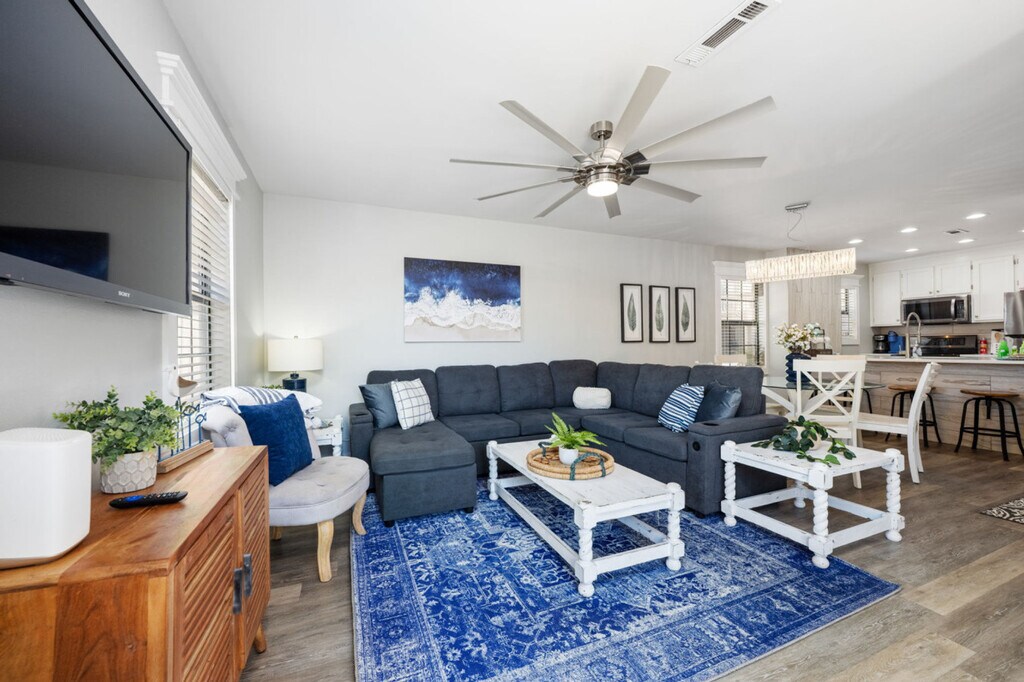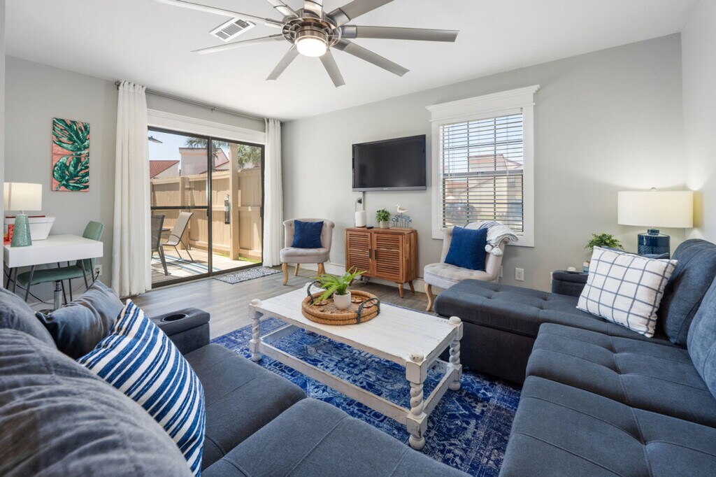 Feel at home in this 2-bedroom, 1,066 sq. foot townhouse, nestled a quick 4-minute stroll from the sugar white sandy beaches of Panama City Beach. This 2-story townhouse is an ideal base for both families and snowbirds looking to kick back in a laid-back setting. This home comes fully loaded with everything you need for a fabulous stay, including three HDTVs, a private patio, and a fully equipped kitchen. The kitchen contains a full-size refrigerator, oven, microwave, stove, cutting board and knife set, cooking spoon, tongs, ladle and other utensils, pots and pans, paper towel, garbage bags, oil, salt, and pepper, plates, bowls, mugs, glasses and silverware, and a dishwasher with dishwashing tabs. Household amenities include hangers, cleaning supplies, an iron and ironing board, and laundry facilities that include a washer, dryer, and laundry detergent. Enjoy access to 4 swimming pools and a hot tub, all just steps away from the townhouse. Parking is available for 2 vehicles next to the property; parking passes must be purchased at the main office. Wristbands must be worn by everyone while on the premises, including all owners, renters, and guests 6 years of age and older; wristbands must be purchased from property management in the main office. The guest cost for each wristband is $20.00. The cost for each parking pass is $25.00 per vehicle (maximum two vehicles) not to exceed 10 days. An extended stay guest will pay $25.00 per 10-day period with a maximum of $50.00 per six (6) month period. Parking placards shall identify the unit number and the expiration date (debit or credit card only, cash not accepted). Pets are welcome for long-term guests. Enjoy the ease of walking to nearby restaurants, adding a dash of culinary delight to your stay. A short 10-minute drive will land you at entertainment hotspots such as Gulf World Marine Park, SkyWheel, and Swampy Jack's Wongo Adventure. Shop ‘til you drop at Pier Park Shopping Center featuring over 120 stores, restaurants and entertainment options including laser tag and the grand IMAX theater (~10-minute drive). Explore Panama City Beach with ease using Bike the Beach PCB, conveniently located just a 4-minute drive from our home. Grab a bike rental and embark on an adventure to must-visit destinations such as Frank Brown Park, Scott Field Park, and Russel Fields Pier. Upon arrival at Horizon South all guests are required to register with Property Management and purchase a vehicle parking pass (maximum 2) for each vehicle and wristbands for all guests 6 years and older. These must be purchased from Property Management in the main office located inside the large building by the pools. Enter the office and someone will assist you at the registration window. The office is open daily from 8:00 AM CST to 4:00 PM CST. You may visit the office on your second day of stay. Check-in time begins at 4 pm and check-out time is set at 10 am. Registration Number: 64628 [SI]