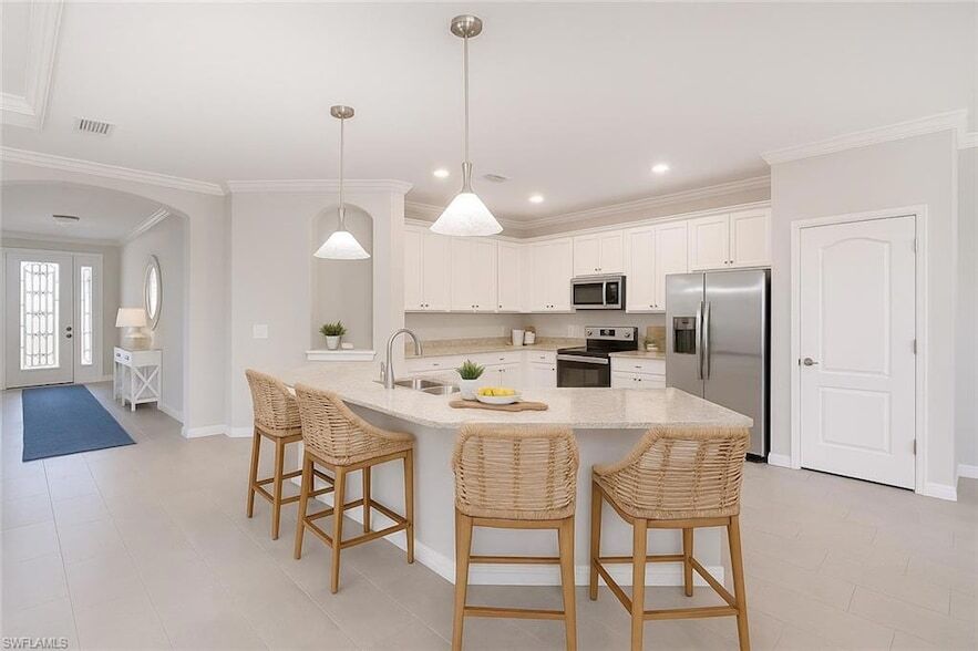 This is an ANNUAL rental AVAILABLE NOW! Turnkey, furnished, pet friendly SINGLE-STORY LIVING with 4 BEDROOMS, 2 FULL BATHROOMS, and a 3-CAR GARAGE. Set on an OVERSIZED PIE-SHAPED LOT, this home combines modern convenience with timeless Florida style. Inside, TILE FLOORING runs throughout, and the MAIN LIVING AREA includes CROWN MOLDING and a TRAY CEILING, creating an elevated yet inviting atmosphere. The open-concept KITCHEN features abundant CABINET SPACE. The BREAKFAST NOOK is perfect for casual meals, while the GREAT ROOM opens through SLIDING GLASS DOORS to the LANAI for seamless indoor-outdoor living. A FORMAL DINING AREA provides space for entertaining. The PRIMARY SUITE offers a TRAY CEILING, AMPLE NATURAL LIGHT, PRIVATE LANAI ACCESS, and a LARGE WALK-IN CLOSET. The ENSUITE BATH includes DUAL VANITIES and an OVERSIZED SHOWER. Two GUEST BEDROOMS are conveniently located near a full bathroom, while the FOURTH BEDROOM is tucked away for privacy, ideal as a HOME OFFICE, DEN, PLAYROOM, or PRIVATE GUEST SUITE. Outdoor living is a true highlight with a SPARKLING SALTWATER POOL and ELEVATED SPA WITH WATERFALL SPILL OVER FEATURE, LUSH PRIVACY HEDGES, and a FULLY FENCED BACKYARD. The oversized 3-CAR GARAGE includes EPOXY-FINISHED FLOORS, BUILT-IN SHELVING, KEYLESS GARAGE ACCESS, and an ELECTRIC VEHICLE HOOKUP.Everyday conveniences are moments away with a new Publix Plaza just outside the gate, offering dining, shops, and services.One or more photo(s) has been virtually staged, AI generated or rendered.