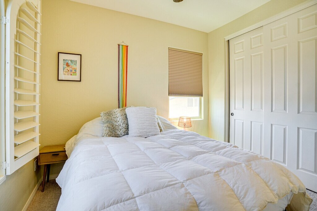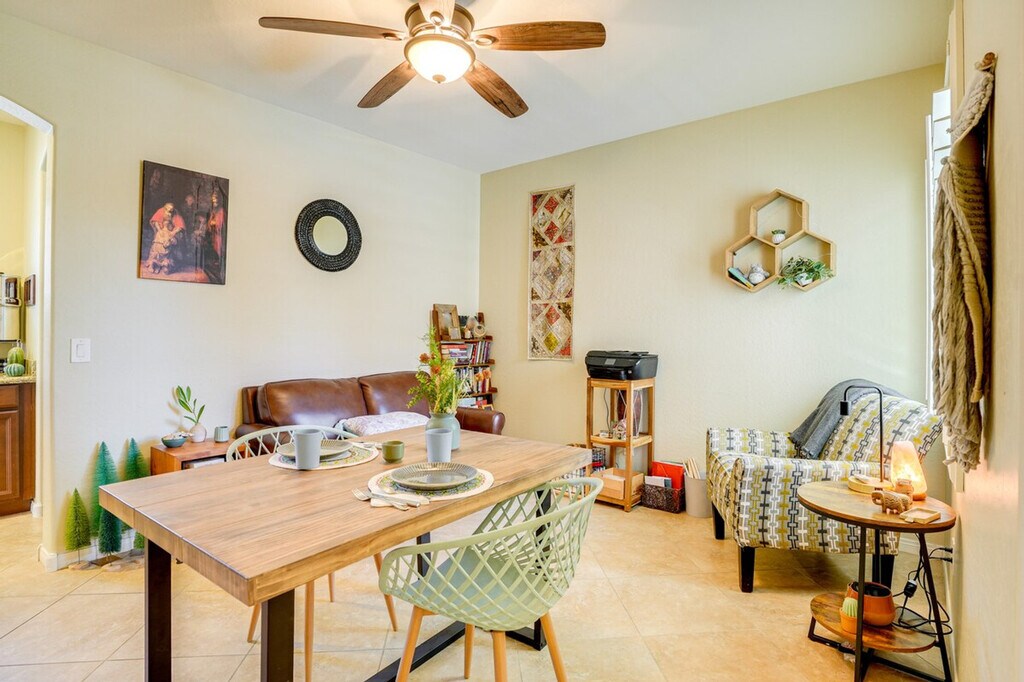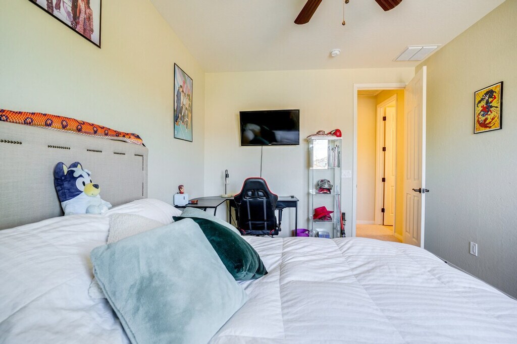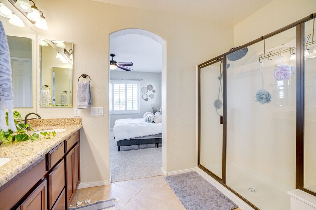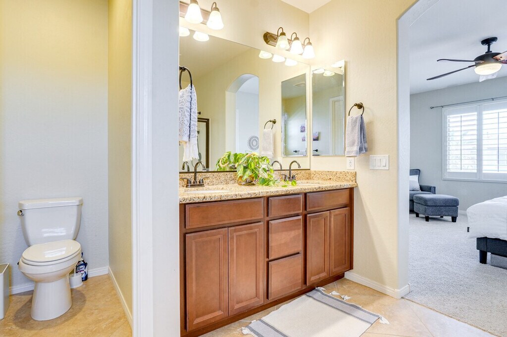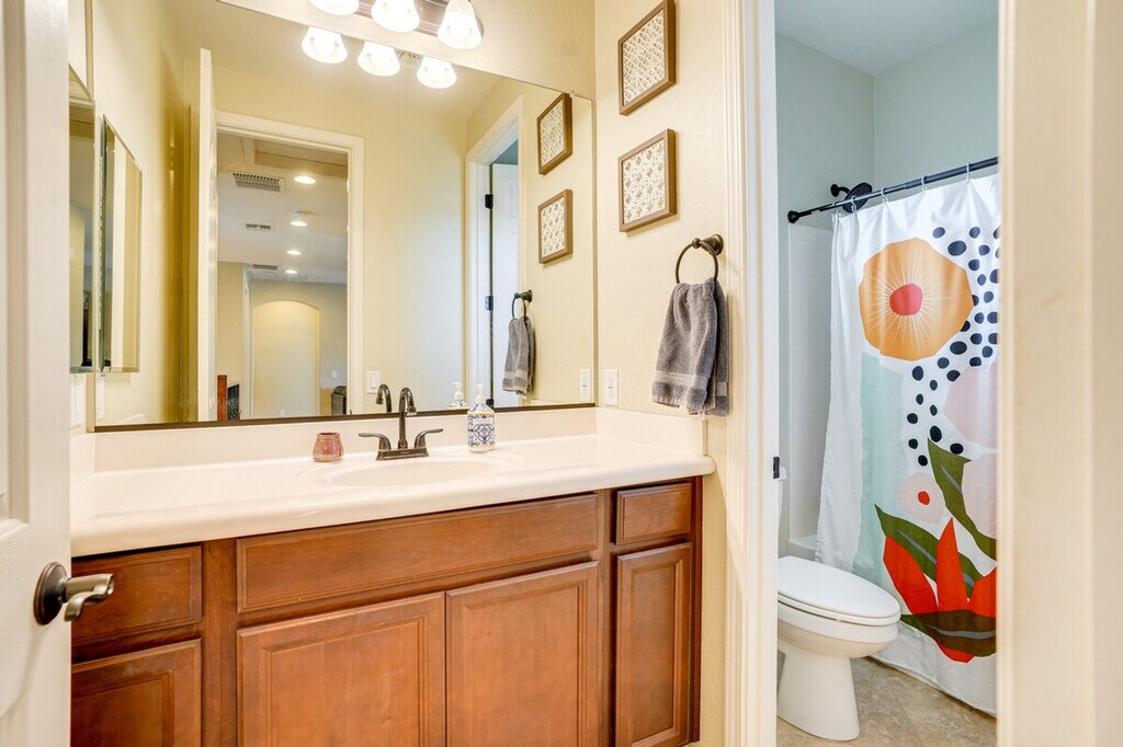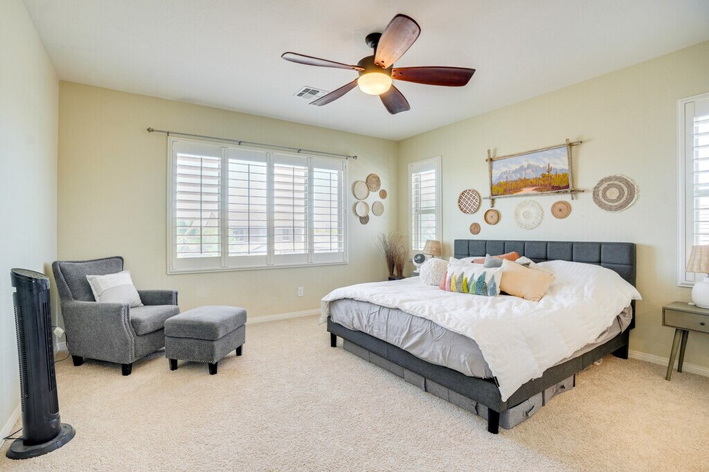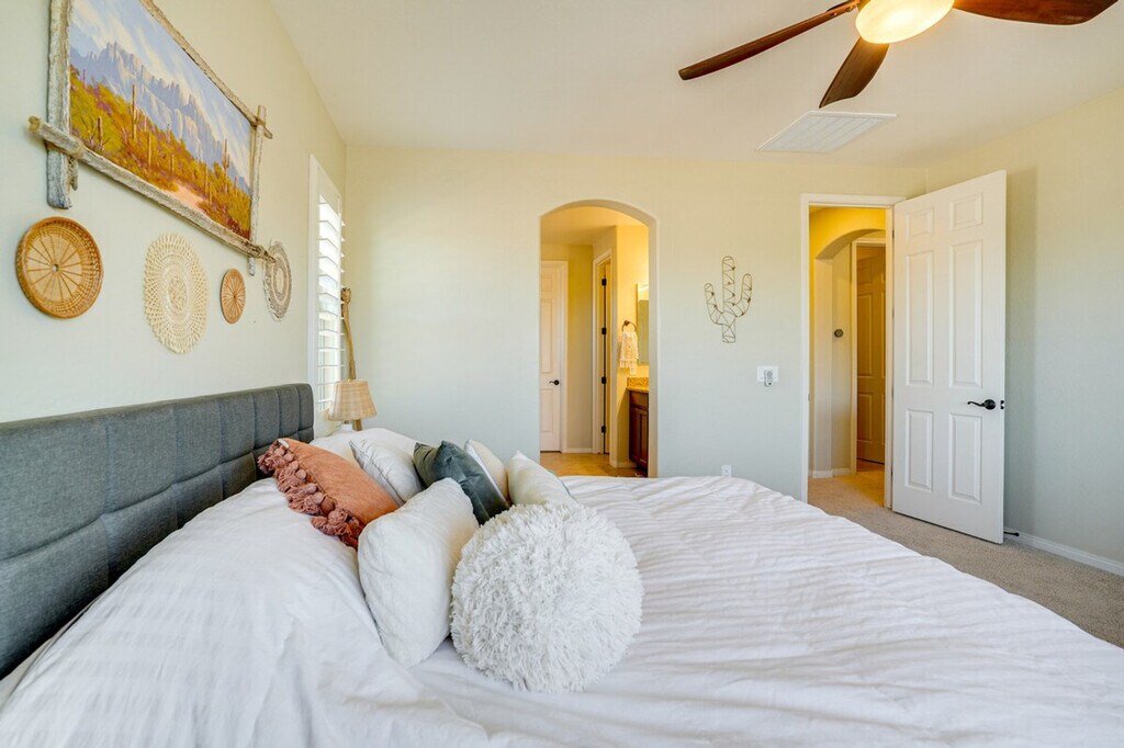 The advertised rate of $9,962/month is the lowest available price, based on a 30 day(s) stay with a move-in date of August 26, 2026. Rates vary depending on the duration of stay, season, and other parameters. For exact pricing and additional pricing components, please visit our website and enter your desired move-in and move-out dates. The rate is applicable when billed upfront; it can be higher if billed in multiple payments. Feel at home in this tranquil vacation rental in Goodyear, Arizona. This 3-bedroom, 2.5-bathroom home is perfect for relaxation and play. This home boasts a private pool, putting green, and a backyard designed with palm trees and birds. Enjoy the community amenities including pickleball courts, basketball courts, sand volleyball courts, and lake access, as well as several hiking and biking trails. The outdoor living space features a covered patio, outdoor dining areas, a built-in gas grill, a gazebo with a flat-screen TV and lounge seating, a gas fire pit, chiminea, outdoor umbrellas, and swings. The kitchen is fully equipped with a stove/oven, refrigerator, dishwasher, microwave, toaster oven, blender, drip and French press coffee makers, coffee grinder, espresso machine, rice cooker, Crockpot, air fryer, waffle maker, juicer, food processor, KitchenAid mixer, dishware/flatware, cooking/baking basics, spices, trash bags, and paper towels. Indoor entertainment includes three living areas, six Smart TVs, a PlayStation 4 and Nintendo Switch consoles, a DVD player, a video library, Sonos speakers, a record player, books, puzzles, board games, two dining tables, a breakfast bar, a wet bar, an electric piano, and a telescope. Pets are welcome with a $150 fee. There is an optional pool heat fee of $75 per night. After exploring Estrella Mountain Regional Park, return to this home and gather with loved ones in a living area of your choice, or sip a drink under the starry sky. This is a 2-story home with a step to enter, and all bedrooms and full bathrooms are located on the second floor. There are three exterior security cameras: one at the front door facing the front entrance, one at the back door facing the back entrance, and one at the gate facing the side of the home. The cameras are outward facing and do not look into interior spaces. The cameras are activated by motion and will record video and sound while guests are in residence. Quiet hours are from 10:00 PM to 7:00 AM. Includes a workstation and a wireless printer. [SI]