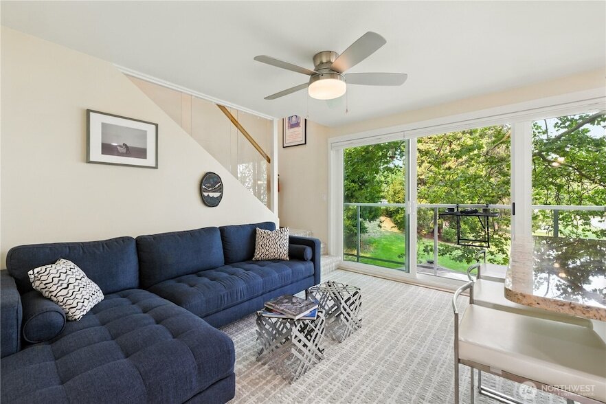 Welcome to Madison Park Waterfront, the height of luxury living on beautiful Lake Washington! Two-level condo, including top floor, with two bedrooms, two bathrooms, and assigned parking space in secure garage. Enter to light-filled main floor with open living space and gleaming kitchen with stainless appliances. One bed and one bath on each floor for privacy. Balconies on each level for outdoor enjoyment. Upstairs are additional living space with private entry and in-unit washer and dryer. Stunning Lake and Mount Rainier views from private community dock. Two storage lockers plus space for kayaks and paddle boards for lake enjoyment. This well-run premier complex includes on-site manager and secure parking. Water/Sewer/Garbage included in rent. Steps away from Madison Park beach, restaurants, and shops, plus community activities including concerts, yoga, and markets.
