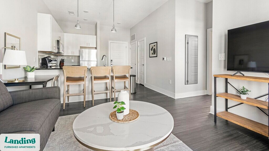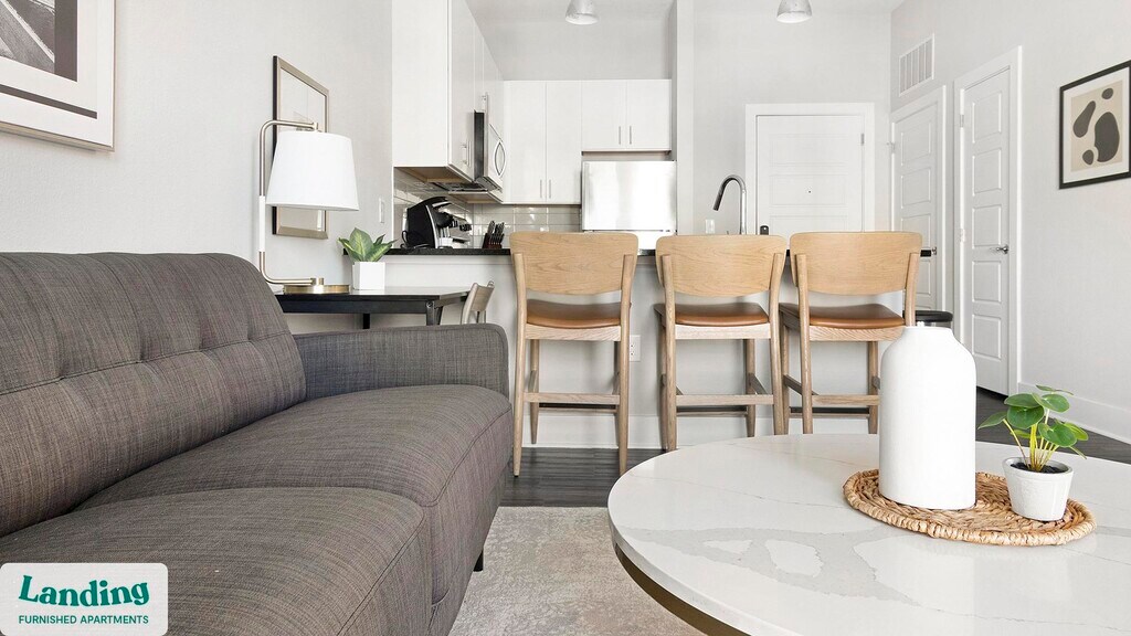 Landing offers flexible lease terms from weeks to months. Please always visit our website or contact us for the latest pricing & availability. Stay longer, save more: 6-Month Minimum base rent: starts at $2100/mo 12-Month Minimum base rent: starts at $1678/mo Landing offers flexible leases across a network of over 35,000 fully-furnished apartments throughout 375+ cities so you can rent on your terms, practically anywhere, and avoid the hassle of paying deposits or application fees. Visit to learn about all the benefits of a Landing membership, see our competitive up-to-date pricing, explore available apartments, take virtual tours, and make reservations online without jumping through traditional rental hoops. Landing's apartments at The Exchange are designed for comfortable, easy living, with the ability to stay as long as you like. Experience living with Landing Every apartment is outfitted with all the modern essentials including: custom-designed furnishings, a fully-equipped kitchen with deluxe stainless steel appliances, a gourmet coffee maker, premium linens, Smart TVs, and incredibly fast, reliable internet for working from home. When you live with Landing, you'll enjoy a hassle-free experience with the added benefit of 24/7 access to our dedicated member experience team. Some of the nitty-gritty: a background check and proof of income are required; we're completely smoke-free; bundled utility packages and pricing vary based on length of stay; pet-friendly options available; listed price reflects a 12-month minimum stay.