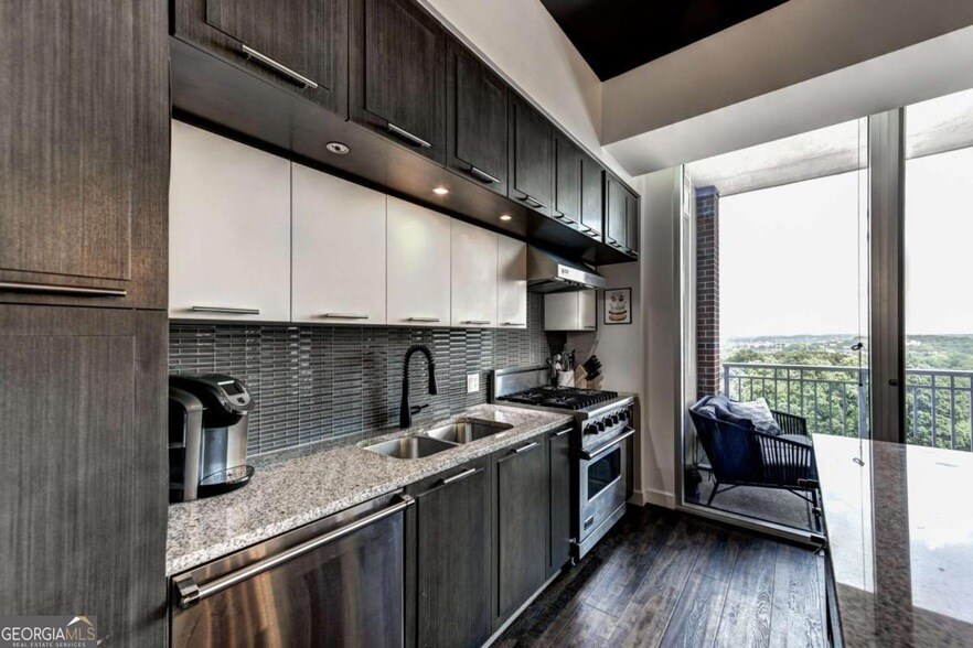 Elevated above the city in Atlanta's premier LEED Certified residential tower, this impeccable 2BR + Den, 2.5BA home at The Brookwood redefines modern sophistication. Panoramic sunrise views of Buckhead pour through dramatic floor-to-ceiling windows, complemented by a private walk-out balcony. Inside, 10' ceilings, designer lighting, and newly installed hardwood floors set the stage for inspired living. The open-concept kitchen impresses with a Viking stainless steel appliance suite, granite counters, and two-toned cabinetry flowing seamlessly into the Great Room. The expansive Owner's Suite boasts a custom walk-in closet and spa-style bath with floating double vanity, soaking tub, and a frameless glass shower. A second bedroom with en-suite bath and a versatile Den-perfect as a home office-complete the floor plan. Two secure parking spaces included. Residents enjoy unrivaled amenities: Peloton-equipped gym, saltwater pool, outdoor grills and fireplace, club and billiard rooms, dog park, guest suites, concierge, and on-site dining. Walkable to Bobby Jones Golf Course, the Northside BeltLine, and top shopping and dining. Positioned between Midtown and Buckhead, this is city living at its finest.