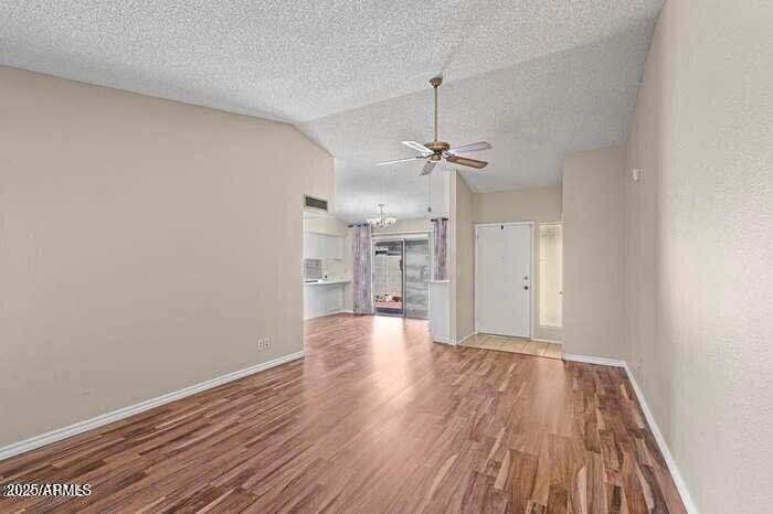 Charming townhome in Bellair Estates featuring a bright great room with vaulted ceilings, fireplace, and wood laminate flooring. Both bedrooms are spacious and flexible for guests or a home office. Enjoy two private fenced patios that extend the living space. A new AC unit was installed in 2024 for added efficiency. Located in a well-kept community with convenient access to I-17 and Loop 101, and just minutes from shopping, dining, and Arrowhead Mall.