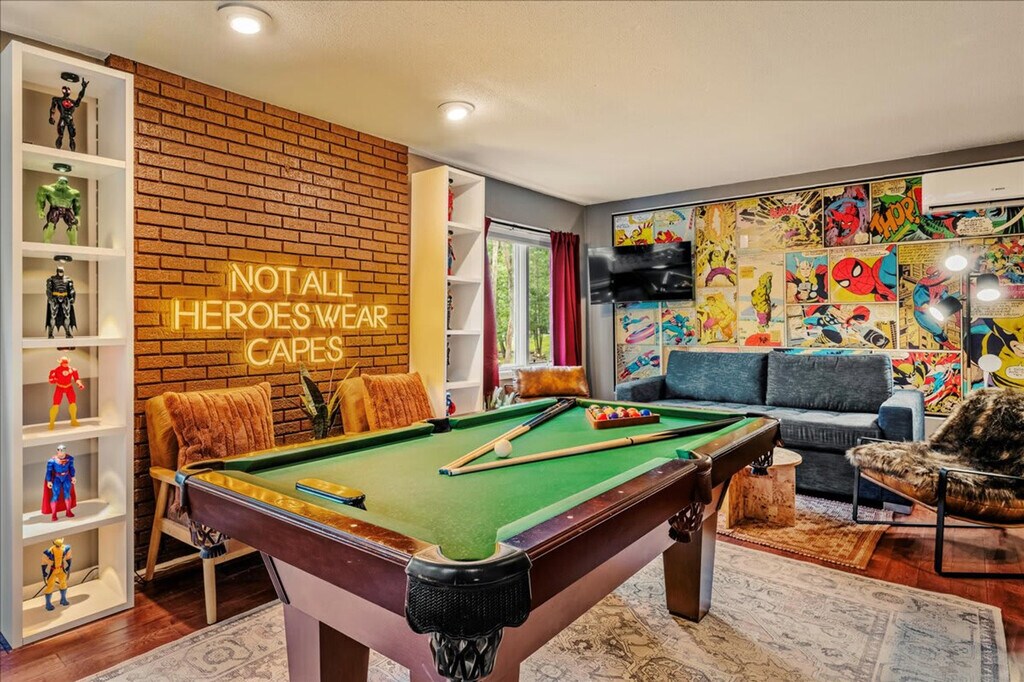 This 4-bedroom home is in a prime location in Stroudsburg, PA, offering everything you need for an amazing vacation. With 2.5 bathrooms, it comfortably accommodates up to 10 guests, making it ideal for families, groups, and friends. The home features an open layout with cozy living spaces, a fully stocked kitchen, and a game room with an indoor bar. Step outside to enjoy a private backyard oasis with a hot tub, fire pit, and outdoor dining area. Welcome to your perfect mountain getaway in the heart of East Stroudsburg, PA. This spacious home features cozy living spaces, a fully stocked kitchen, and a game room with an indoor bar, pool table, foosball table, and arcade games. The outdoor area includes a hot tub, fire pit, and patio for enjoying the fresh mountain air. Up to 2 dogs are allowed for $125 per stay. The community offers access to pools, tennis courts, and playgrounds, with 10 community amenity badges provided for guest use. Any lost, missing, or unreturned badges will incur a $150 replacement fee per badge. Located just minutes from Shawnee Mountain, Camelback Resort, Bushkill Falls, and the Delaware Water Gap, this home is your perfect base for skiing, hiking, waterparks, or simply relaxing in the heart of the Poconos. Nearby attractions include Shawnee Mountain Ski Area, Pocono Snake & Animal Farm, Resica Falls Scout Reservation, Frazetta Art Museum, and Schisler Museum & McMunn Planetarium. Enjoy dining at local favorites like Farmhouse Café & Eatery, Kitch-en, Khan’s Mongolian Grill, Zack’s Tacos, and Yard of Ale. Check-in is at 4pm and check-out is at 10am. The home is located within the Penn Estates community, offering a gated neighborhood experience. Only registered cars can enter the HOA, and once registered, they cannot be swapped. No parties are allowed, and violations may result in immediate termination of the stay. Parking is available for 4 cars in the driveway, with no street parking allowed. An exterior camera monitors the cleaning team for quality and security purposes. Guests must be 21 years or older to book this property. A remote work-friendly environment is provided with Wi-Fi access throughout the home. [SI]