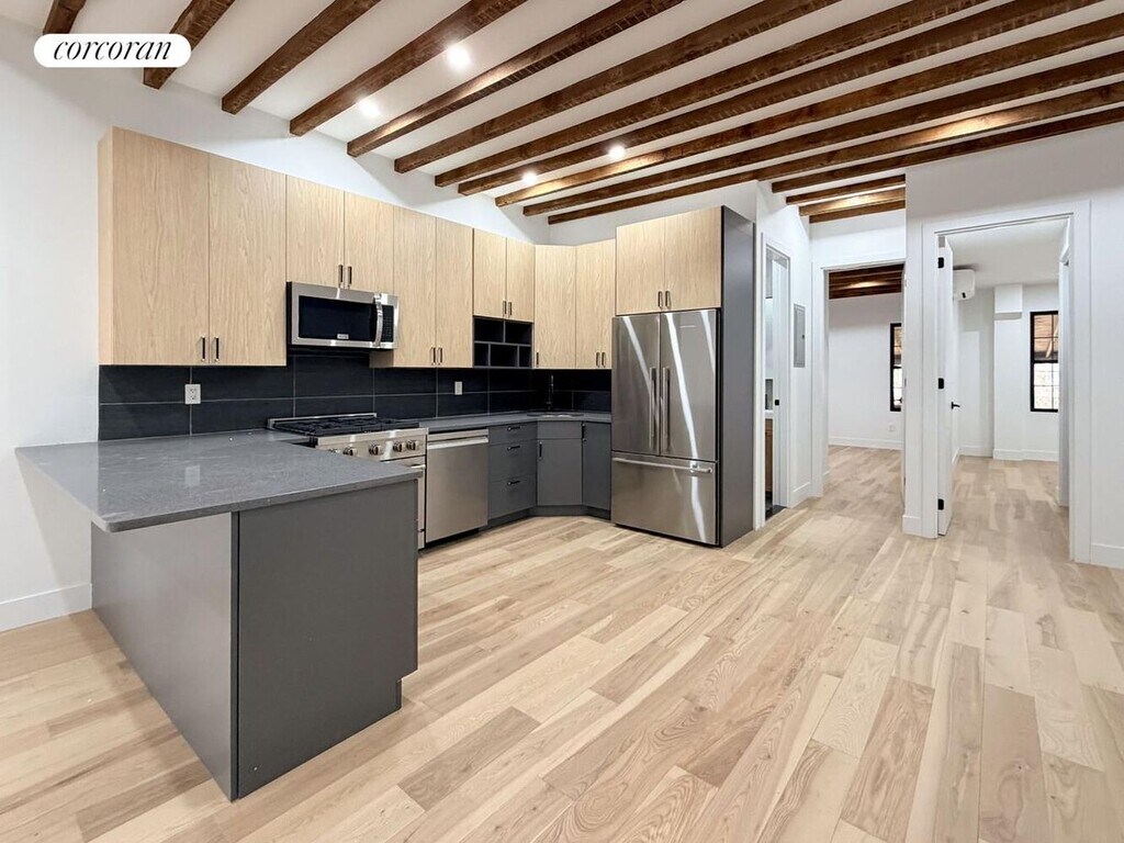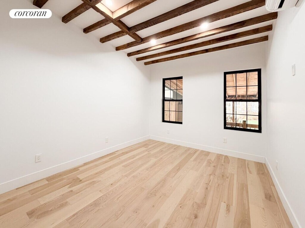 Greenpoint Duplex with Expansive Backyard and Versatile LayoutThis contemporary 3-bed+bonus room, 3-bathroom duplex offers generous proportions, thoughtful design, and rare outdoor space-just two short blocks from the G train in Greenpoint. A 20 ft wide apt is unlike other apt in the neighborhood. With 2,000 sq ft, and a substantial 1000 sqft exclusive yard, it's proportions are of a modest townhouse.The main level features 10-foot ceilings, beautiful wood floors, and an open-concept living, with a separated dining, kitchen with full-size stainless steel appliances including a refrigerator, microwave, and dishwasher. The south-facing living room window frames treetop views and adds a sense of openness to the space. Three well-sized bedrooms on this floor offer closet and storage space, with one room leading to a covered porch extension and further to the backyard, ideal for outdoor dining or relaxing.Additionally the other floor offers a nearly identical floor plate. With ceilings over 7 ft and a bathroom, allow it to serve as an art studio, an office, workshop, music practice room, gym or media lounge. Here you can find a dedicated laundry room with full-size washer and dryer, a ductless heating and cooling system, and direct access to the backyard via a short set of exterior steps.A covered rear patio adds versatility-perfect for a workshop, shaded lounge, or additional storage. The serene, flower-lined backyard opens to an expansive view of blue sky, creating a calm and private setting rarely found in the neighborhood.Located minutes from local favorites including La Merced, Wen-Wen, Radio Bakery, Ilis, Lil Armenia Café, Leroy's, MoKafe, Le Fanfare, and Troost, this residence combines modern comfort with the vibrant character of Greenpoint living.$20 Application feeDue at lease signing: Security deposit 1 full month of rent1st full month of rent