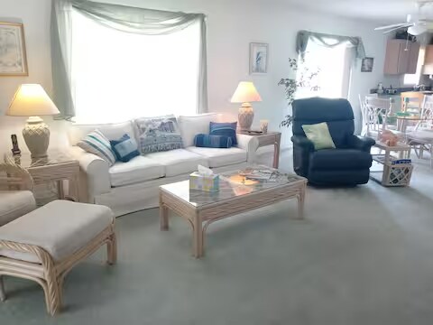 Property Id: 2162673 Peachtree Villa is an attractive two bedroom two bath courtyard villa on a dead end street in an established and quiet neighborhood in The Villages. A large kitchen with a breakfast bar, plenty of countertop space and plenty of cabinets along with a pantry. The main bedroom has a queen size bed and two bureaus, two bedside tables, a ceiling fan, and a large window and sliding patio door. There is also a private full bath. The guest bedroom has a king size bed, two bureaus, and bedside tables. The guest bath has a tub/shower and a large vanity. The living room leads into a 3 season lanai. The villa is equipped with internet and DISH TV. There is a one and a half car garage that includes a washer and dryer.