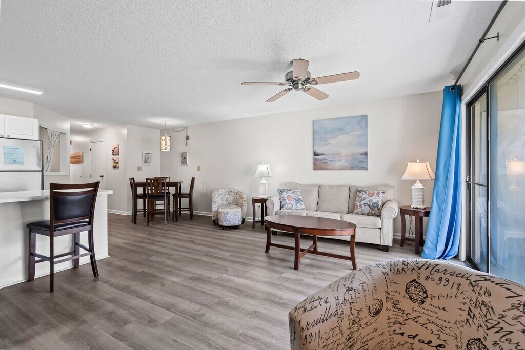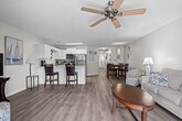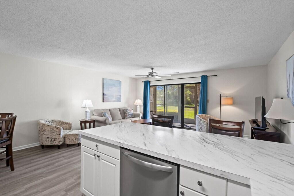 Feel at home in this lovely 2-bedroom, 2-bath ground floor condo, just steps from the pool, offering a quiet and comfortable retreat. The primary bedroom features a king-size bed, walk-in closet, smart TV, and en-suite private bath with a tub/shower combo. The second bedroom has two comfortable twin beds, another smart TV, closet, and large dresser. A second bathroom with a stand-up shower is steps away from that bedroom. The open-plan kitchen/dining/living room makes family gatherings more fun and interactive. The dining table comfortably seats four, and there are two additional bar stools at the kitchen peninsula. Just steps from the lovely pool deck with outdoor gas and charcoal grills, is the screened porch for those afternoons when you want to relax out of the sun and mosquito-free. Linens for all beds, bath towels, hand towels, and wash cloths are provided. Additionally, there will be a roll of paper towels in the kitchen, two rolls of toilet paper per bathroom, hand and dish soaps, two laundry pods, and two dish pods. You can rent a gas-powered golf cart to get around during your stay if you don't plan on going super far, and there is access to get to amenities by golf cart during the day. Renting super light and durable backpack-style beach chairs is available through a link after your booking. Golf Colony Deerfield is an ideally located, quiet, and comfortable resort in the heart of Surfside Beach and very close to so many great options. Just 1.5 miles from the closest Surfside Beach access, you will be almost anywhere on the South Strand in under 15 minutes. The Myrtle Beach International Airport is just 15 minutes away. The property is non-smoking, and pets are not permitted. Quiet hours are between 11 pm and 7 am as per Surfside Beach ordinance. The minimum age requirement to book is 25. Check-in is from 4:00 to 10:00 PM, and check-out is at 10:00 AM. [SI]
