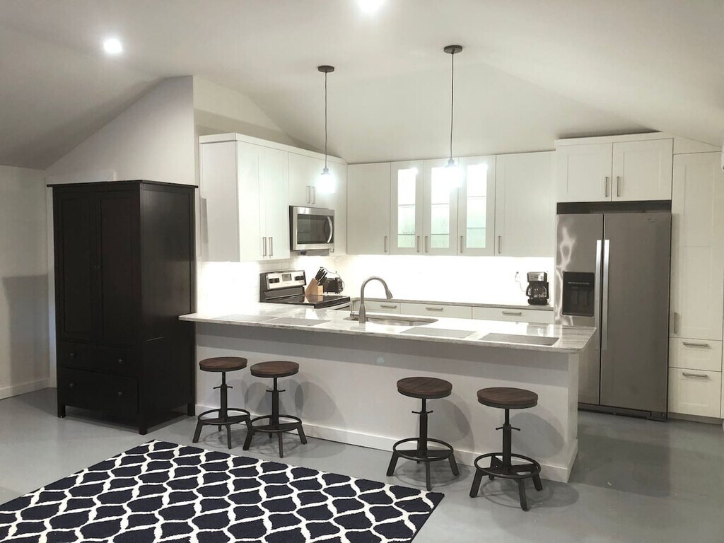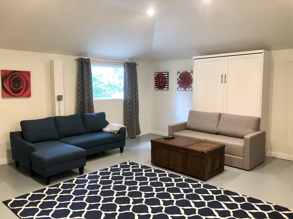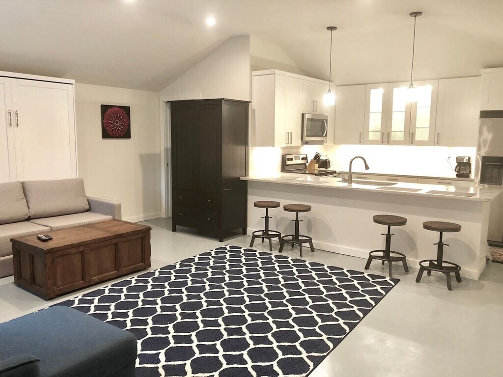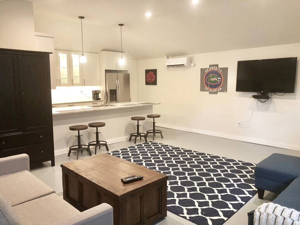 Feel at home in this modern studio guest house, a perfect hotel alternative. It's walking distance to The Swamp, Ben Hill Griffin Stadium, and UF. This beautiful studio guest house features a newly remodeled kitchen, bathroom, and living room. It has a modern look with painted concrete flooring and bright, cheerful decor. A 55" TV and space-saving features, like a Murphy bed and pull-out couch, maximize the space. A queen-size Murphy bed with a super comfortable mattress and a full-size pull-out couch allow for space during the day and comfort at night. The house is a studio guest house with its own entrance and driveway, accessed through a shared courtyard. A $250 fee will be assessed for smoking inside the home. A $200 fee will be assessed if a pet is found on the property. Quiet hours are from 9:30 pm to 8 am, and you may be asked to leave without a refund for violating this policy. [SI]