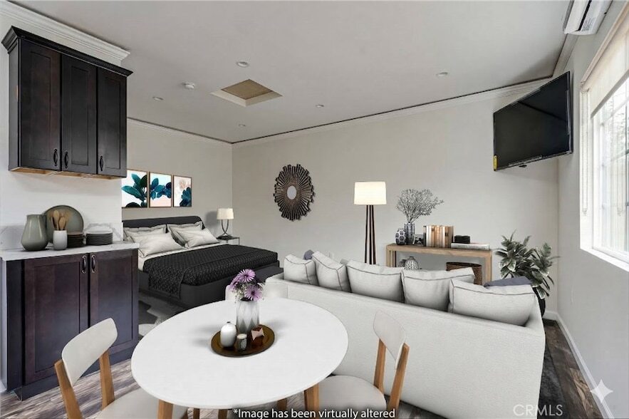 Welcome to this detached studio guest house (ADU) with private entrance and quaint entertaining space. Upon entering, you'll notice the dual paned windows that allow for ample light to flow through this studio space making it light and bright. An open concept kitchen featuring a quartz countertop that has ample storage. Put your own spin on it and define the layout for an eating area, bedroom, and family room; which is perfect for your guests or just lounging around. While there's no access to the main house and yard, there is a private patio where you can make it come alive with potted plants, table and chairs and a bbq or consider outdoor furniture for a resort feel if that's more your style. Virtually staged, it gives you an idea of how to organize this modest space.
