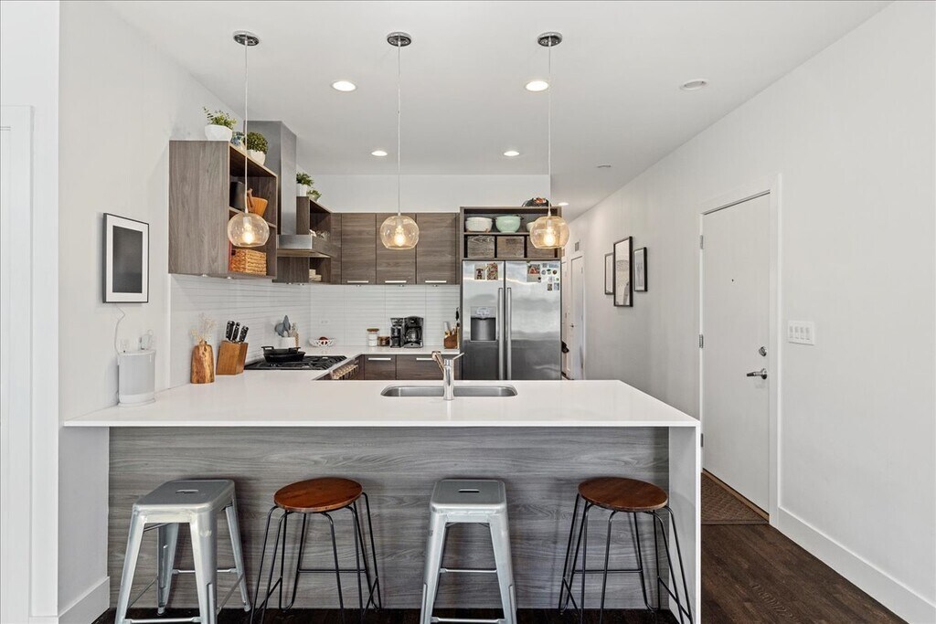 Tucked away on a peaceful, tree-lined block in the heart of Wicker Park, this stylish 2 bed / 2 bath condo blends modern comfort with luxury finishes. Soaring 9-foot ceilings and oak hardwood floors set the tone for a bright, open living space filled with natural light. The chef-inspired Italian kitchen features quartz countertops, a Viking range, Bosch appliances, and direct access to a private side balcony ideal for grilling. The primary suite offers a spa-quality retreat with heated floors, a steam shower, and body sprays accented by Toto and Hansgrohe fixtures. A spacious rear deck is perfect for entertaining or relaxing outdoors, and a private storage unit adds convenience. -- Property Management firm requires mandatory Resident Benefit Package additional $40.00 per month; includes renters insurance, positive credit reporting for on-time rental payments, identity fraud protection and more.