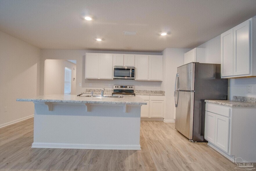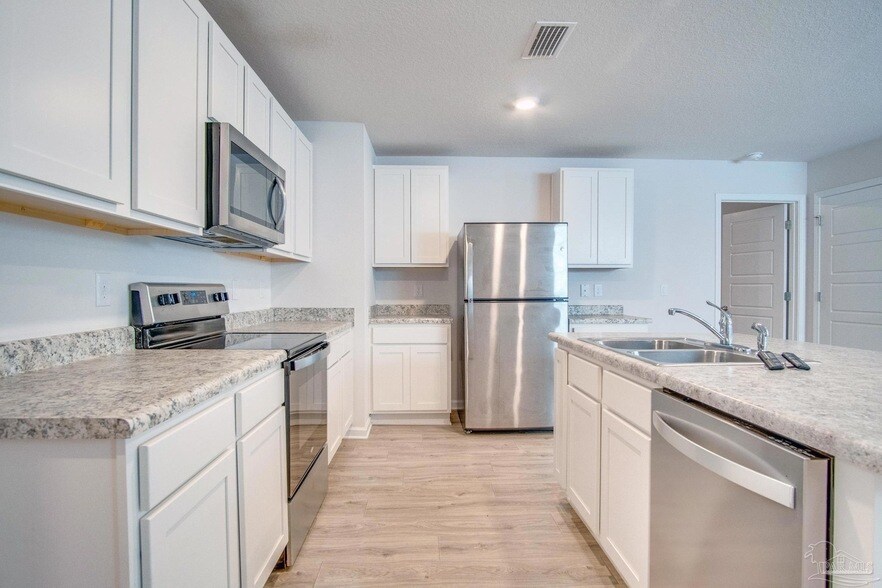 Newer construction 3/2 home in the Ashland Manor subdivision in North Pensacola off 9 Mile Rd. This home features an open-concept layout with wood-look flooring throughout the main living areas and a kitchen equipped with all stainless steel kitchen appliances, plenty of cabinets, and a large island with bar seating. The carpeted primary bedroom includes a private ensuite bathroom with a double sink vanity, walk-in shower, and walk-in closet. Two additional carpeted bedrooms share a full bathroom with a tub/shower combo. A covered back porch overlooks the unfenced backyard. Pets are accepted upon owner approval with a $250 non-refundable pet fee per pet. Residents are required to have renter liability insurance, which can be added for $11.95/month, or you can opt into the Resident Benefits Package (RBP) for $45/month, which includes renter liability insurance, HVAC air filter delivery, and on-demand pest control. Ready for move in!