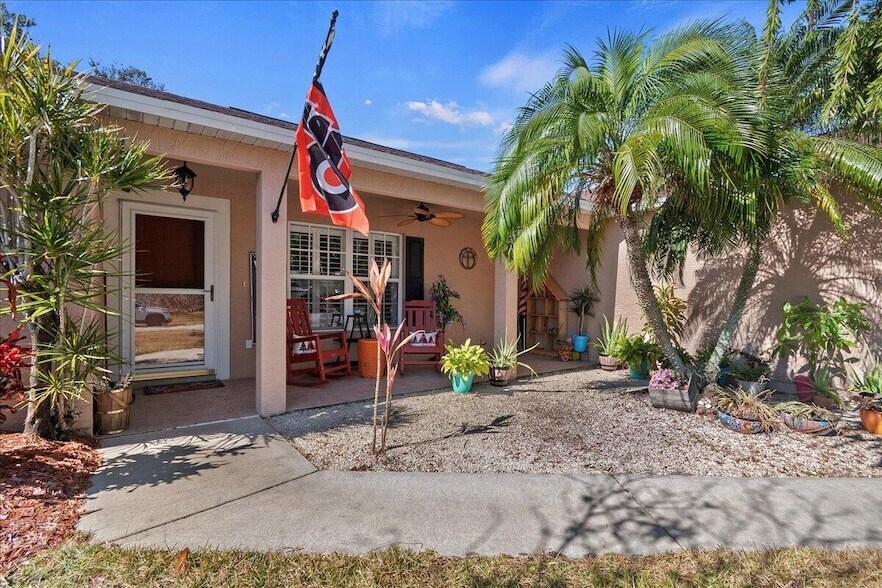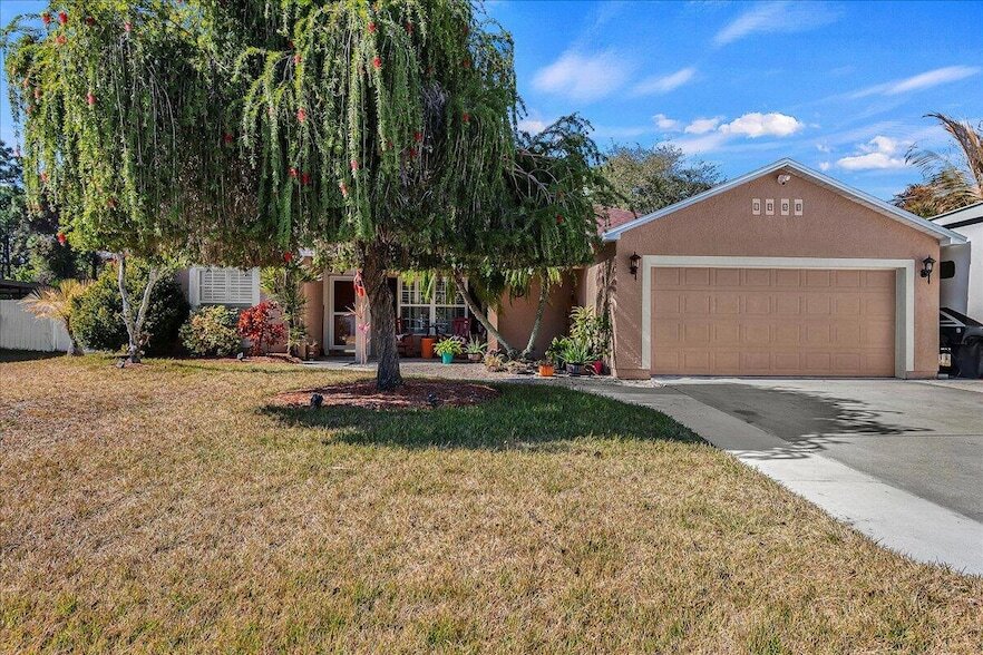 Beautiful 3BR/2BA CBS pool home with 2-car garage located east of US-1. Offering 1,496 SF under air, this split-bedroom floor plan features vaulted ceilings, ceramic tile throughout, a spacious living area, and an open kitchen with ample cabinetry. The primary suite includes dual sinks and a walk-in closet. Enjoy a screened lanai, private pool, fenced yard, and covered front porch. City water and sewer plus well irrigation for lawn care. Conveniently located near beaches, shopping, dining, hospitals, and more.