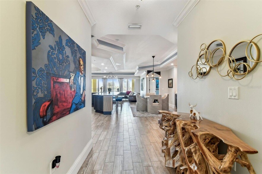 Experience Luxury Waterfront Living at The Majestic Point. Welcome to one of Island Estates most exclusive boutique residences, with just 14 luxury condos. This fully furniture stunning home offers breathtaking, unobstructed views of open water and nightly sunsets from the living room, kitchen, and primary suite. Watch sailboats and cruisers drift by from your expansive, covered balcony the perfect spot to unwind, rain or shine.Inside, the open-concept layout enhances the home s spaciousness and flow. The chef s kitchen features stainless steel appliances, granite countertops, custom cabinetry, and an oversized island with bar seating ideal for entertaining. The split-bedroom floor plan ensures privacy, with a luxurious primary suite that includes private balcony access, his-and-her custom closets, dual vanities, and a walk-in shower.Additional upscale touches include custom electric-automatic blinds and shades with smartphone and voice commands, tray ceilings with crown molding and ambient lighting, and a luxury equipped-Bar. The laundry room equipped with new washer and dryer machines. Residents enjoy premium amenities: a resort-style pool with heated spa, outdoor grilling and dining areas, secure storage, and gated under-building parking.Situated less than a mile from the award-winning Clearwater Beach, Island Estates offers a self-contained lifestyle with a Publix, fine dining, and the Clearwater Aquarium. Just over the bridge, you'll find PGA golf courses, top-rated hospitals, and all the conveniences of the mainland.With its refined design, boutique exclusivity, and unbeatable location, this property presents a rare opportunity to live the ultimate waterfront lifestyle.