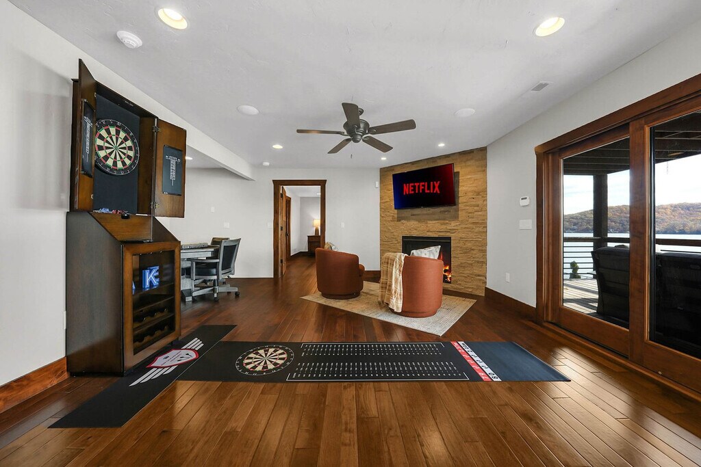 Feel at home in this 5-bedroom luxury home in a prime location in Sunrise Beach, Missouri. This spacious retreat features 5.5 bathrooms and comfortably accommodates up to 20 guests. Designed with relaxation and fun in mind, this home features ample living spaces, a fully stocked chef’s kitchen with high-end appliances and a large island with high seating, a living room with a smart TV, a large leathered sofa, an indoor fireplace, and expansive windows. Enjoy the game room with video games, board games, a poker table, and darts. The home also features multiple decks with rock chairs and amazing views. The heated pool fee is $125 per night, and heating is recommended between October and May with at least a 3-day notice before arrival. The pool must be heated for the entirety of your stay. Enjoy easy access to sun-soaked adventures, water sports, and local dining. Nearby attractions include Paradise Tropical Restaurant & Bar (2 miles), Franky & Louie’s Beachfront Bar & Grill (3 miles), The Branding Iron Restaurant & Saloon (4 miles), ShrimpDaddy’s (5 miles), and The Tavern at Trails End (3.5 miles). Explore Pirate’s Point Gas Dock & Boat Rentals (2.5 miles), Bridal Cave & Thunder Mountain Park (11 miles), Lake of the Ozarks (1–3 miles), Ha Ha Tonka State Park (20 miles), and Lake Ozark Helicopters (14 miles). Check-in is at 4 pm and check-out is at 10 am. No pets are allowed. No parties are allowed—violations may result in immediate termination of the stay. An exterior camera is installed solely to monitor the cleaning team for quality and security purposes. There is a no-shoes-indoors policy. Parking is available for 6 vehicles in the driveway and 2 in the garage; street parking is not allowed. Guests must be 25 years or older to book this property. [SI]