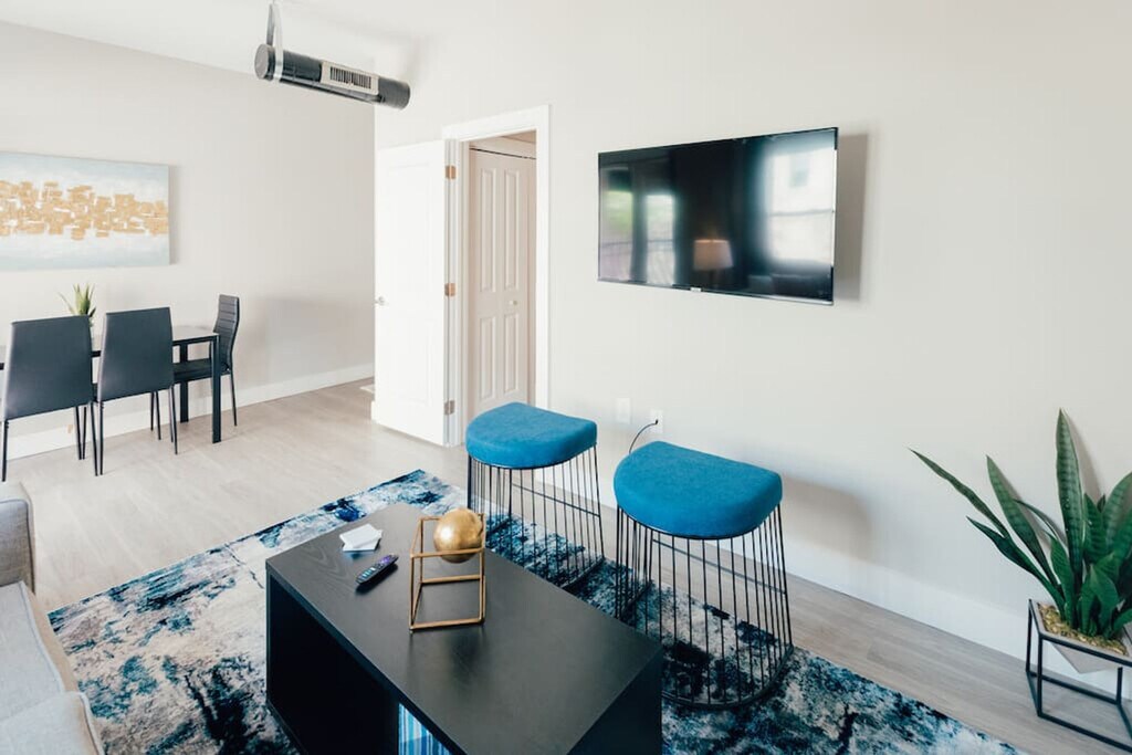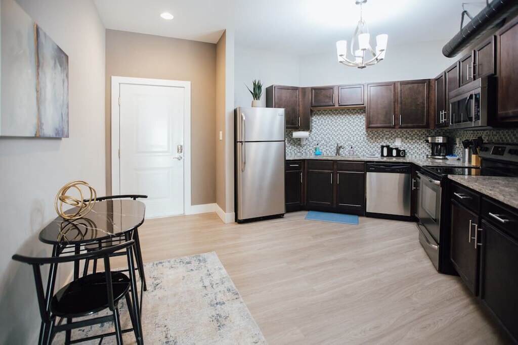 Welcome to this 1-bedroom, 1-bathroom apartment in downtown Johnson City, where you'll feel at home. This apartment overlooks a breezy courtyard. This bright and airy apartment features modern furnishings and a cozy living space. Pets are welcome with a flat fee of $100 to cover the extra cleaning costs. A maximum of two pets are allowed, but no cats or birds. Located in the heart of downtown JC, this apartment is steps away from restaurants, breweries, parks, and a new theatre. You'll have easy access to the farmers' market and Founders Park. There is even a restaurant under the complex for easy access to brunch, dinner, and events! Since this apartment is in the heart of downtown, you might hear some noise from trains and nightlife. Quiet hours are observed between 10 pm and 8 am. Smoking and vaping are not permitted inside the property and will incur a $200 per day fee. If your party receives a lease violation you will receive a $500 penalty. If there is evidence of pet hair found on furniture there will be an additional $75 deep clean fee. Guests are responsible for any stains that are not easily removable and may be charged for cleaning costs or replacement of damaged items. [SI]