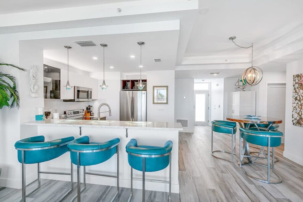 Experience the heightened luxury of this Starboard Elite apartment, offering the sophistication and space of the standard Starboard unit with the added allure of a higher vantage point. This 3-bedroom retreat is designed for comfort and style, featuring queen beds, a fully equipped kitchen, and an open living area. Its east-facing balcony provides an exceptional view of sunrises, rocket launches, and the tranquil canal, ensuring a memorable stay. Welcome to Merritt Island's newest resort community, Cape Crossing Resort and Marina. Nestled on the eastern "starboard" side of the resort, this condo offers a sublime escape into tranquility. Step inside and discover a well-appointed living area, thoughtfully designed to provide an inviting ambiance for relaxation and socializing. The kitchen is fully equipped, allowing you to effortlessly whip up your favorite meals with modern appliances, ample counter space, and a pantry. Enjoy your culinary creations at the dining table or on the breezy balcony, where you can savor your meal while soaking in the panoramic views of the resort. The condo boasts three dreamy bedrooms, each furnished with a cozy queen-sized bed, and two full bathrooms featuring modern fixtures and walk-in showers. Plenty of parking is available on the property. While only dogs are allowed at this property, a fee of $100 per pet per stay applies. Cape Crossing is a waterfront "Old-Florida Keys" style resort located on Merritt Island, Florida, where vacationers and corporate travelers can enjoy a fun-filled Florida adventure with all the comforts of home. Dolphins Waterfront Bar and Grill at Cape Crossing is the largest tiki bar and restaurant on Florida’s Space Coast, offering a Florida fresh theme with a Polynesian twist. Kayaks, paddle boards, pontoon rentals, and boat slips are available for exploring the rivers, canals, or tributaries. Plan a day at the beach or explore the other attractions in the Merritt Island community. Uber and Lyft are prevalent in the area, making it easy to get around. An initial stock of essentials such as paper towels, toilet paper, tissues, coffee pods, creamer, sugar, light cleaning supplies, garbage bags, sponges, dish soap, and dishwasher tabs is provided. If additional supplies are needed during your stay, plan to replenish them as needed. Mailbox access is not available for guests. [SI]