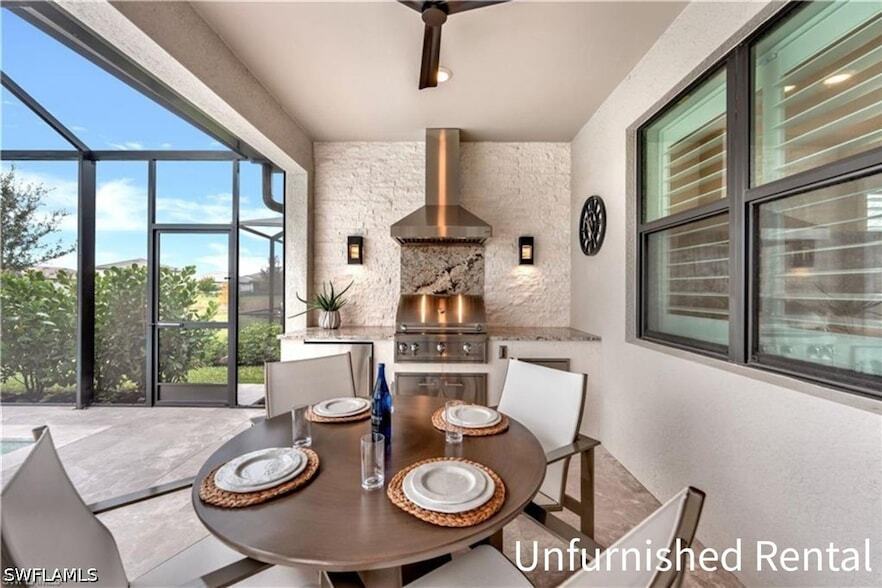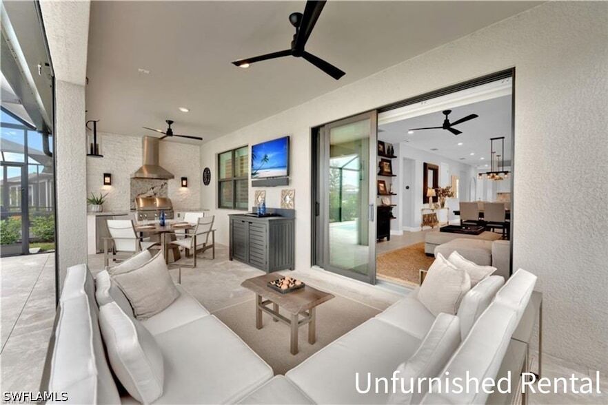 This Rental isn't until 6/1/2027. Available as an ANNUAL UNFURNISHED RENTAL in VERDANA VILLAGE! (Also available for Sale!) Enjoy southern lake views, a custom saltwater pool & spa, whole-home natural gas Generac generator, hurricane-impact windows and doors, and electric Storm Smart hurricane shades this beautifully upgraded residence offers worry-free, resort-style living in one of Southwest Florida s most sought-after communities. This Pulte-built Contour floor plan in Verdana Village features 2 bedrooms + den, 2 full bathrooms, and 1,405 square feet of thoughtfully designed living space, combining modern luxury with low-maintenance convenience. Inside, you ll find tile flooring throughout the main living areas and den, recessed lighting with dimmers, premium 5-inch baseboards, plantation shutters, and custom valances throughout. The kitchen is well-appointed with Whirlpool stainless-steel appliances, a brand-new KitchenAid dishwasher, externally vented range hood, tile backsplash, soft-close cabinetry with pull-out shelving, custom pantry shelving, natural gas appliances, water softener, and reverse osmosis system. The primary suite offers a tray ceiling, plush carpet, peaceful lanai and lake views, and a spa-like en-suite bathroom with a framed glass shower with bench, tile to the ceiling, rain shower head, dual vanities, and a custom walk-in closet. The guest bedroom and bathroom provide privacy and comfort with a framed glass shower, tile to the ceiling, and comfort-height vanity. A dedicated laundry room and two-car attached garage add everyday convenience. Step outside to your private retreat on the panoramic frameless screen-enclosed lanai, featuring a custom saltwater pool and spa with leathered marble pavers, premium Diamond Bright quartz-mixed plaster, oversized sun shelf, two bubblers, hidden drains and skimmer, and a gas heater. The fully equipped outdoor kitchen includes granite countertops and backsplash, grill with rotisserie and griddle, vented hood, beverage cooler, and ample dining and lounge space perfect for relaxing or entertaining year-round. Located in Verdana Village, residents enjoy access to indoor and outdoor pickleball, tennis, basketball, three resort-style pools, dog park, state-of-the-art fitness center, yoga studio, and multiple on-site dining options. Just steps away are The Shoppes at Verdana Village, offering Publix, restaurants, salons, and everyday conveniences. Ideally situated 15 minutes to Southwest Florida International Airport, 10 minutes to Miromar Outlets and Gulf Coast Town Center, 5 minutes to Old Corkscrew Golf Course, and approximately 45 minutes to Bonita Beach and Fort Myers Beach. This is a rare opportunity to enjoy a luxury, low-maintenance, resort-style lifestyle in a nearly new home move in and start enjoying the best of Southwest Florida living.
