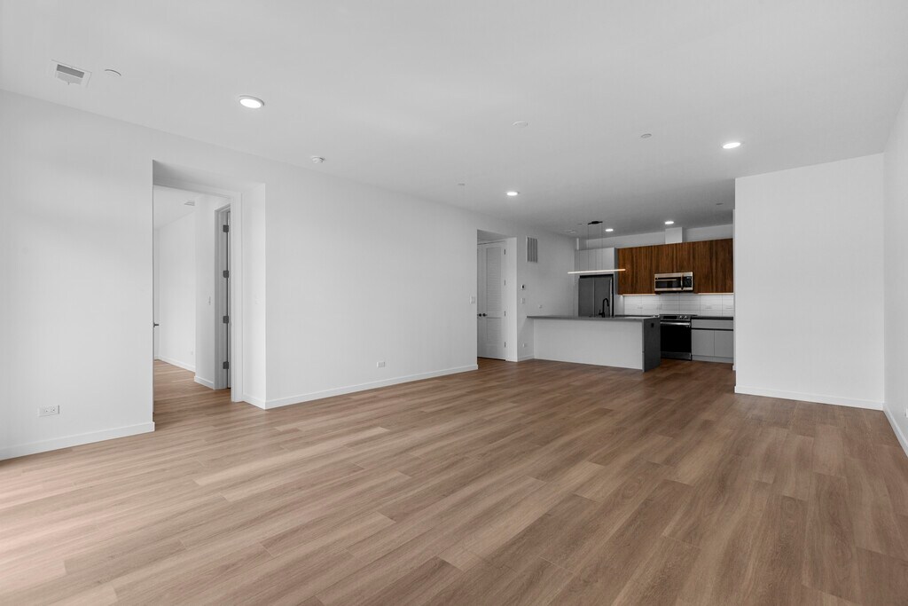 Welcome to The Leavitt, a beautifully designed community offering a spacious 3 Bed, 2 full bath corner unit with bright southern and eastern exposures. The open-concept layout has nine-foot ceilings and a sleek, modern kitchen equipped with custom quartz countertops, soft-close cabinetry, and stainless steel smart appliances. The primary bedroom includes a walk-in closet and an oversized walk-in shower, while the second bathroom offers a large soaking tub for a relaxing experience. Additional highlights include hardwood flooring throughout, a full-sized smart washer and dryer, custom window treatments throughout, and a private balcony. This all-electric building provides a streamlined living experience, with only the electric bill as your responsibility. High-speed internet from Zentra is included in the monthly rent. Constructed with high-quality materials, the building also prioritizes sound absorption between units. The entire building also features wireless keyless entry for added convenience. Gated private parking, both indoor and outdoor is available for an additional amount, along with indoor bicycle storage. Conveniently located less than four blocks from the United Center, the Medical District, and Pete's Fresh Market, the Green Line Damen stop is just a 3-minute drive or 14-minute walk away, with I-290 expressway access two blocks from your door.