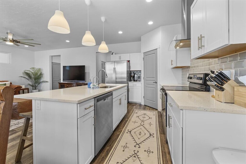 Stay in this modern, two-story home in Nampa, featuring a queen-size bed in each room. Enjoy the large patio area with lounge seats and a good-sized backyard, perfect for spending time with friends and family. The home is equipped with smart TVs in every room and offers a large desk in the master bedroom and a small desk in the second room, ideal for individuals working remotely. The fully stocked and equipped kitchen and in-house washer and dryer add to the convenience of this home. Experience easy self check-in and enjoy being just 10 minutes down the road from local attractions. This home is professionally cleaned and sanitized between each guest, ensuring a welcoming and safe environment. The master bedroom features a large walk-in closet and a private bathroom, while the entire space is professionally decorated with unique furnishings and a warm ambiance. Driveway and garage parking are available, although parking areas are quite small, which may be challenging for larger vehicles. Driveway and garage parking are available, although parking areas are quite small, which may be challenging for larger vehicles. Located in Nampa, this home offers easy access to local attractions, just 10 minutes down the road. Enjoy the convenience of being close to everything you need while having a private fenced yard for relaxation. This property is a good-sized single-family home with three bedrooms, a good-sized living room, large patio, and backyard. Enjoy easy self-check-in via a secure door keypad. The home is remote work-friendly with fast Wi-Fi, a large desk in the master bedroom, and a small desk in the second room, making it ideal for working remotely.