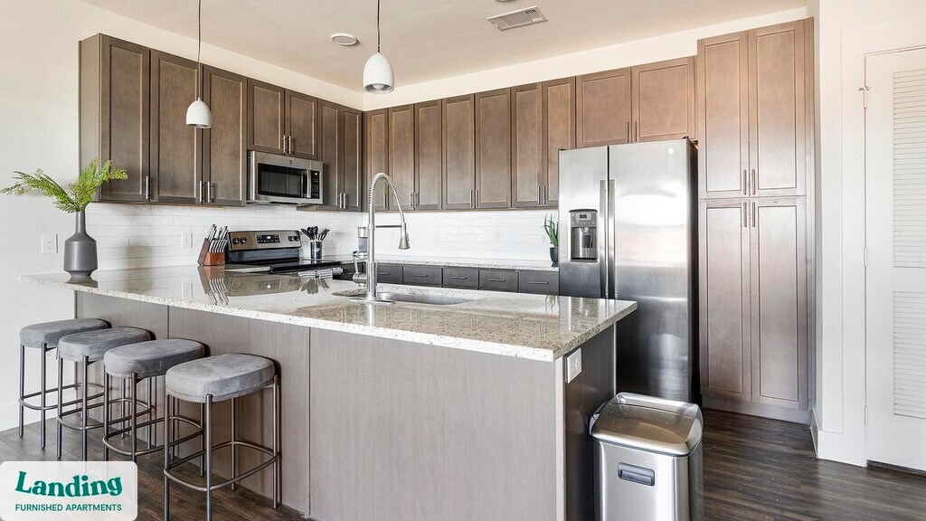 Landing offers flexible lease terms from weeks to months. Please always visit our website or contact us for the latest pricing & availability. Stay longer, save more: 6-Month Minimum base rent: starts at $2052/mo 12-Month Minimum base rent: starts at $1728/mo Landing offers flexible leases across a network of over 35,000 fully-furnished apartments throughout 375+ cities so you can rent on your terms, practically anywhere, and avoid the hassle of paying deposits or application fees. Visit to learn about all the benefits of a Landing membership, see our competitive up-to-date pricing, explore available apartments, take virtual tours, and make reservations online without jumping through traditional rental hoops. Landing's apartments at Vecina are designed for comfortable, easy living, with the ability to stay as long as you like. Experience living with Landing Every apartment is outfitted with all the modern essentials including: custom-designed furnishings, a fully-equipped kitchen with deluxe stainless steel appliances, a gourmet coffee maker, premium linens, Smart TVs, and incredibly fast, reliable internet for working from home. When you live with Landing, you'll enjoy a hassle-free experience with the added benefit of 24/7 access to our dedicated member experience team. Some of the nitty-gritty: a background check and proof of income are required; we're completely smoke-free; bundled utility packages and pricing vary based on length of stay; pet-friendly options available; listed price reflects a 12-month minimum stay.