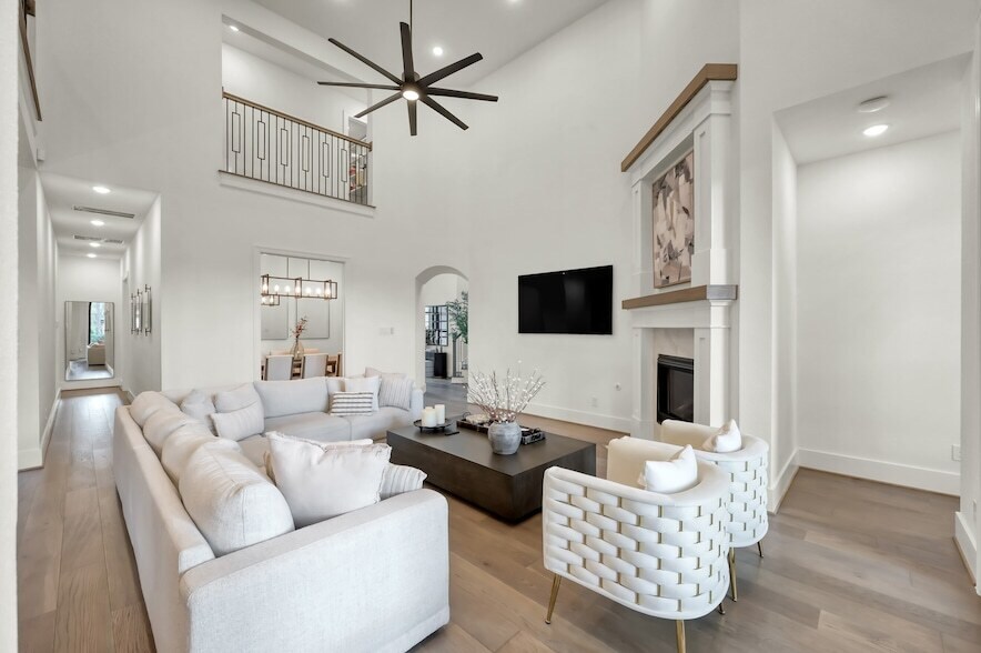 Stunning home in Noble Greens featuring soaring ceilings, a sweeping staircase, and a light-filled living area anchored by a dramatic fireplace. The chef s kitchen offers quartz countertops, a large island, Caf appliances, gas cooktop, convection oven, and abundant cabinetry. Oversized sliding doors open to a covered patio for seamless indoor-outdoor living. The spacious primary suite features a spa-inspired bath with freestanding tub and separate shower. Five bedrooms each include private baths, plus a dedicated home office and upstairs game room. Energy-efficient features include Energy Star appliances and lighting, Low-E windows, radiant barrier insulation, tankless water heater, and high-efficiency HVAC. A 3-car garage offers space for vehicles and a golf cart. Located minutes from Woodforest Golf Club, Pine Market shopping and dining, trails, parks, pools, and resort-style amenities.