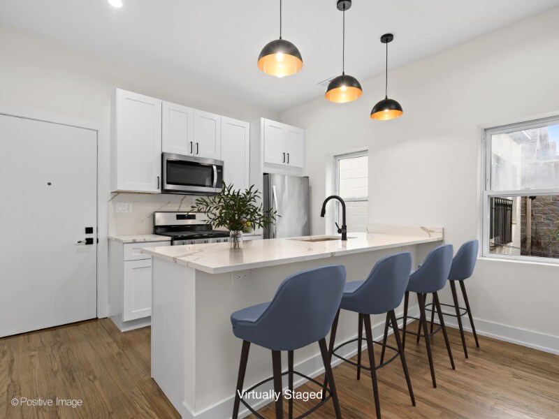 Property Id: 1726428 Welcome home to your updated and refreshed, top floor, 2 bed/1 bath in lovely Logan Square. Stunning open concept kitchen with eat at island, quartz countertops and backsplash, and newer stainless steel appliances including beverage fridge. Bathroom features designer double vanity, and oversized subway tiled shower. Both bedrooms can fit a queen sized bed. Apartment features stunning hardwood flooring throughout, in unit washer and dryer, Nest thermostat for central heat and air conditioning. Pets welcome with additional pet rent and one time $125 pet fee per pet. Ample zone street parking available. Less than a half mile from the Western and California Blue Line stations, Western and Milwaukee bus routes, and incredible shops and restaurants. Easy permitted street parking. Broker owned interest. Listing broker is related to owner and a licensed real estate broker in Illinois.