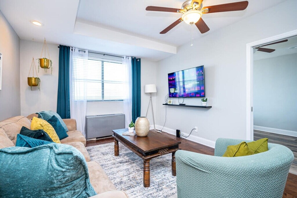 Welcome to this spacious 2-bedroom, 1-bathroom condo located on the 9th floor of a historic building in central downtown Atlanta. With a north-facing view, large windows fill the space with natural light, offering breathtaking city views. Enjoy full access to the entire apartment, basement laundry room, and patio lounge area. This condo offers a bright and airy atmosphere with modern furnishings and decor. The living area features a large flat-screen TV, perfect for relaxation. The two private bedrooms include one with a king-size bed and another with two queen-size beds, providing comfortable accommodation for all guests. Paid parking is available onsite, offering hassle-free options for guests with vehicles. Ideally situated in the heart of downtown Atlanta, this condo is close to key attractions such as MARTA Rail, AmericasMart, World Congress Center, GA Capitol, Peachtree Center, Mercedes-Benz Stadium, GA Tech & State Sports Stadiums, World of Coca-Cola, and Centennial Olympic Park. The MARTA Civic Center station is just two blocks away, making it convenient to explore the vibrant city. The condo is located in the heart of the city, and like other city centers, there may be houseless individuals in the area. The building is currently under construction, and there are blowers in the lobby and hallways to manage odors. The onsite parking lot is privately owned and may have some trash in the area. AC and heating are available seasonally, controlled by the HOA without a thermostat. Quiet hours are from 9:00 PM to 9:00 AM, and the space is for residential use only, not for social gatherings or parties. No pets are allowed, with a minimum fine of $500. A fine of $150 applies for behavior resulting in a false fire alarm, and a $50 fine for smoking in common areas or improper trash disposal. Bicycles are not allowed in the building. Please leave the condo tidy, empty the trash, and start the dishwasher before leaving. Fresh linens are provided, but no maid service is available during your stay. A 24-hour virtual assistant is available for assistance, ensuring a pleasant stay.