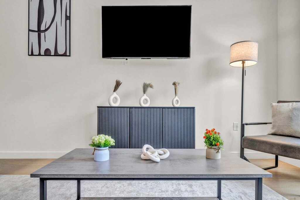 Enjoy a relaxing family getaway and feel at home in this modern 2-bedroom apartment in the heart of Cleveland. Located in the university belt, it’s perfect for couples or small families. This roomy 2-bedroom/2.5-bath unit features a stylish interior design with carefully picked amenities and decorations. The living room includes a sofa bed, a chair, a 4K 55" HDR smart TV, and a coffee table. The fully equipped kitchen features a microwave, stove, oven, refrigerator/freezer, dishwasher, coffee maker with coffee essentials, electric kettle, sink with hot and cold water, glasses, silverware, pots and pans, and a dining table with chairs. The bedroom features a king-size bed with pillows, linens, and sheets, an office desk and chair, and reading lamps. The bathroom is stocked with essential toiletries, including towels, hand towels, and washcloths. Parking is available on the premises, and instructions will be given at check-in. Pets are allowed depending on size or if they are service animals, and an additional cleaning fee is required per pet: 1-7 nights = $20 per pet per night, 8-29 nights = $200 flat rate, 30 nights or more = $300 flat rate. There is a 2 pet maximum and only cats/dogs are allowed. This centrally located apartment is adjacent to Cleveland Clinic’s main campus and minutes from Case Western Reserve University and near University Hospitals. Adventure through University Circle, Little Italy, Coventry, and Downtown Cleveland and experience the award-winning restaurants, bars, shops, art galleries, museums, and attractions. Nearby places include Cleveland Hopkins International Airport (16.3 miles), Cleveland Medical Center (0.2 mile), and Cleveland Botanical Garden (1.1 miles). Nearby restaurants and bars include Presti's Bakery (0.4 mile), Etna (0.3 miles), and Mama Santa's (0.4 miles). Nearby markets include Forest Hills Shopping Center (2.0 miles), FairFax Market (1.2 miles), and Grocery Outlet (1.0 mile). Quiet hours are between 10 pm and 8 am every day, and noise complaints or any violation of this rule may result in cancellation of booking and removal from property without refund. There is a strict no-party policy, and if there is a party of any kind, the police will be called and everyone will be removed from the property with no refunds. No unauthorized guests are allowed at the unit, and there is a $100 fine per guest if discovered. Smoking is prohibited without exception on this property, and if any signs of smoking are found in the unit or on the premises, a fine of $500 will be imposed. If you are found to have brought pets without prior notification, there will be a $500 fee. There will be a $500 fee for lost or unreturned keys. For delayed checkout, there will be a $500 late check out fee, no exceptions. [SI]