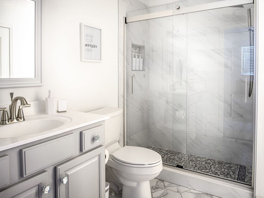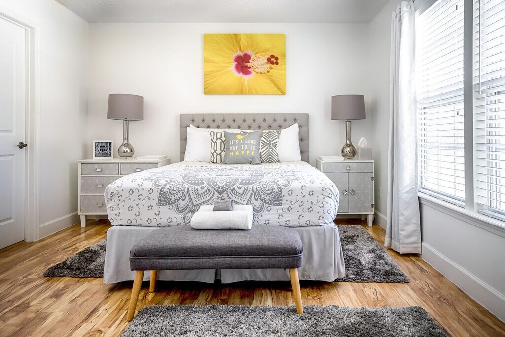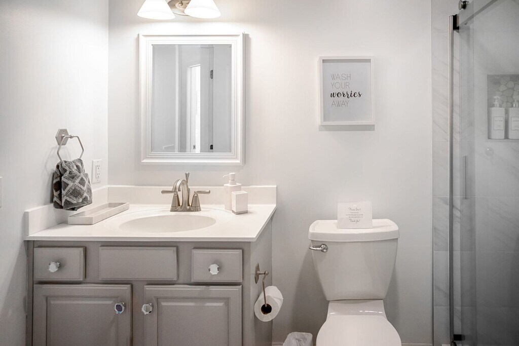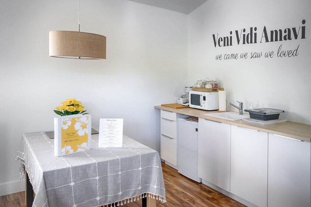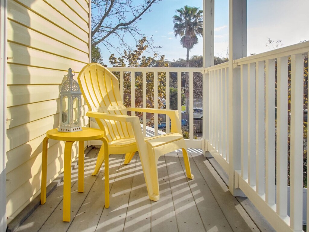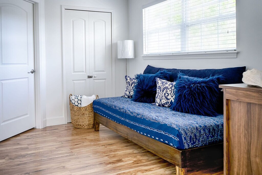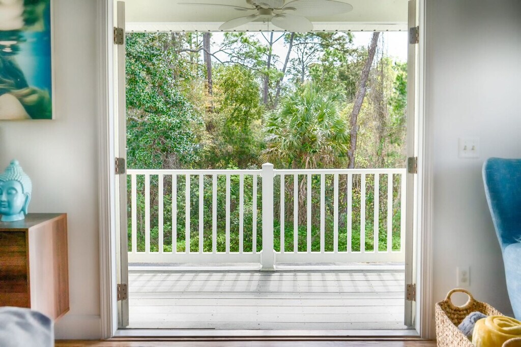 Feel at home in this completely private 1-bedroom, 1-bath guest suite, featuring a private entrance and parking spot. This 2nd-floor guest suite boasts a living room and kitchenette with a cathedral ceiling, leading to your own private balcony overlooking lush green trees in the peaceful neighborhood of Fort Mose. Remodeled and beautifully furnished in a modern, boho-chic style, this suite includes central air-conditioning and heat, high-speed wireless internet, and soft luxury linens. The private bedroom offers a queen bed with a pillow top, blackout curtains, a vanity/desk, and a closet. The living room features a sleeper sofa queen-size bed, a 55-inch Android HD TV with streaming services, and board games. The kitchenette is equipped with a coffee maker, microwave, toaster, mini-fridge, large electric skillet, and cooking utensils. The bathroom has a marble and river rock shower with a rainfall showerhead and two vanities. Parking is available with a shared driveway and one parking space. Plenty of street parking is also available if needed. Located minutes from historic downtown and Vilano Beach, this apartment is in a relaxingly quiet and safe neighborhood. A quick 5-minute walk brings you to Fort Mose, a 40-acre waterfront state park. It is also super close to Vilano Beach and less than 3 miles from downtown St. Augustine. Quiet hours are between 10 pm and 8 am per St. Johns County ordinance and are enforced. No parties or large group gatherings are allowed. No pets are allowed on the property at any time. No vaping or smoking is allowed on the property, including the front porch; if evidence of smoking is found, you will be subject to an additional cleaning fee. Illegal drugs, underage drinking, and moving furniture are strictly prohibited. Guests who stay past the check-out time will be charged an additional fee of $50/hr. [SI]
