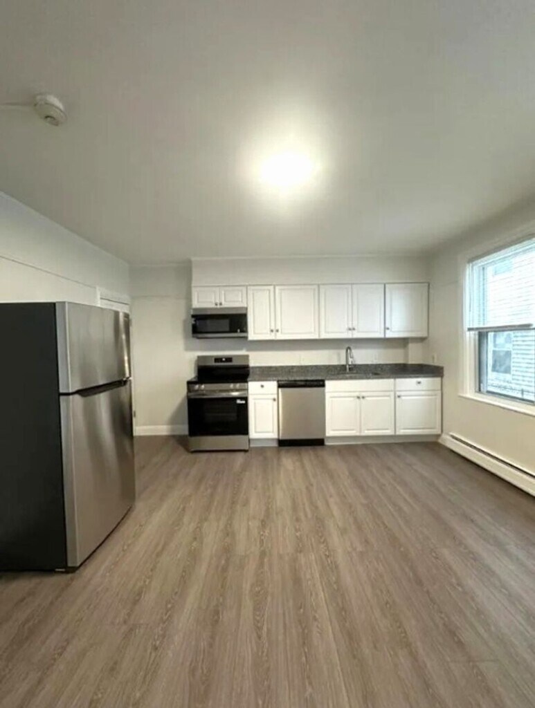 This second-floor unit includes over 750 sq ft of spotless living space with fresh paint, brand new cabinets, and new flooring throughout Renovated kitchen with stainless steel appliances, new dishwasher, new cabinets, and countertops Spacious bed with ample closet space, and great natural lighting Spotless bath with a full tub, new vanity, and luxury vinyl flooring Heat and hot water included, tenant is responsible only for electricity One off street parking spot included Cats are negotiable Located just one minute to I-95, and nearby Agnes E. Little Elementary School, parks, convenience stores, and a short drive to the new MBTA commuter rail station