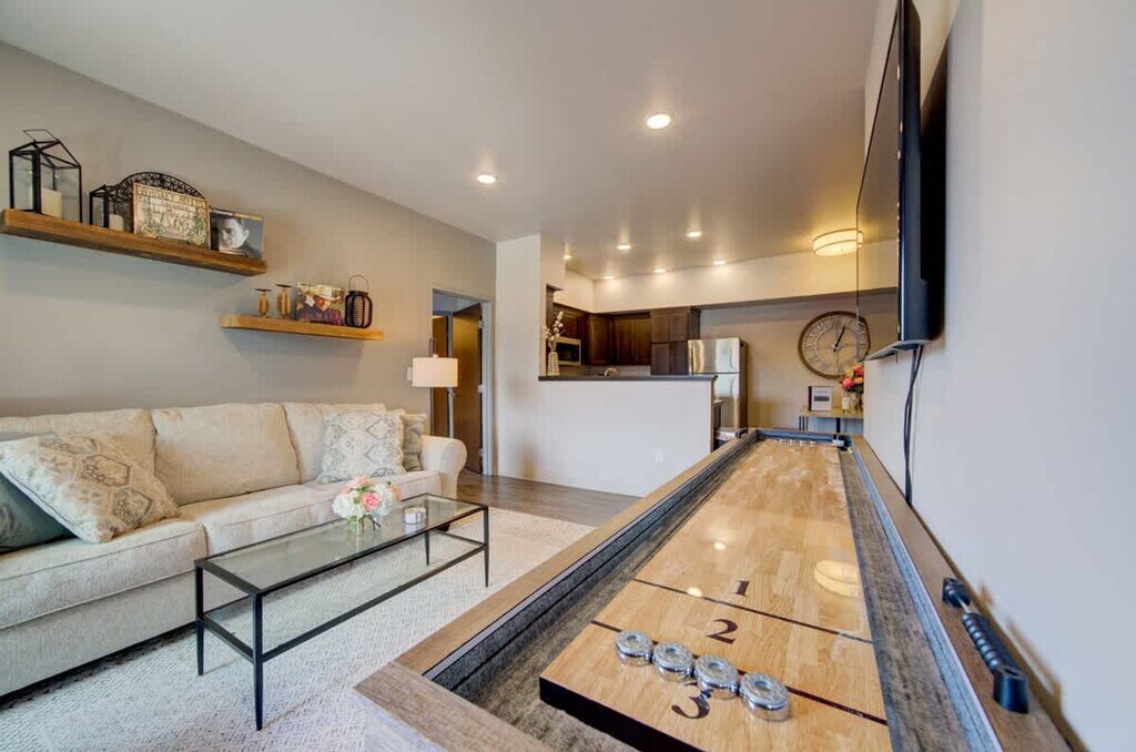 Feel at home in this impeccable 2-bedroom, 2-bathroom condo, nestled just a few blocks from Montana State campus and minutes from everything Bozeman offers. This lavish unit boasts 1,500 square feet of living space and can comfortably accommodate up to seven guests. The open floor plan allows you to make the most of its generous layout. The fully stocked kitchen makes mealtime a breeze with a top-notch set of non-stick pots and pans, along with complementary cooking essentials. The light-filled dining room is open to the kitchen and features a table that can seat seven. The living room, adjacent to the dining area and kitchen, features a 55” TV, a 9-foot shuffleboard, and cozy seating options. The back deck, located off the living room, has outdoor seating. This country condo features a record player with Bluetooth. A rental car is available. There is an open parking lot directly in front of the building. Located just off of 19th street, this condo is within walking distance of MSU and less than 10 minutes from downtown. Bozeman’s Gallatin Field Airport is just a 10-mile drive away. Yellowstone National Park is located just 80 miles away. Horseback riding, rafting, and a plethora of attractions can be found in Bozeman. During winter months, the lodge's proximity to Bridger Bowl Ski Area and Crosscut Cross Country Ski Area, a mere 17-mile drive, make it an ideal choice for winter sports enthusiasts. The Gallatin County fairgrounds, just a few blocks away, offer convenient shuttles to and from Bridger Bowl Ski Area. For skiing and snowboarding enthusiasts, the world-renowned Big Sky resort is located just 45 miles away. There is a community outdoor living area and an outdoor basketball court on site. Includes a workspace. Registration Number: STR23-00060 [SI]