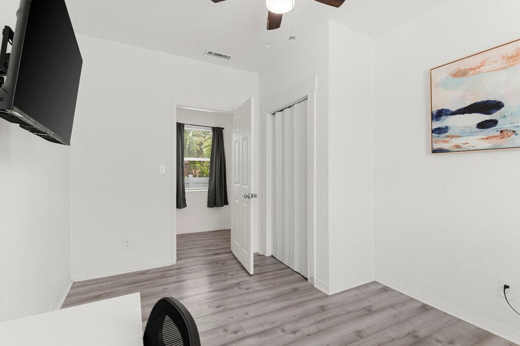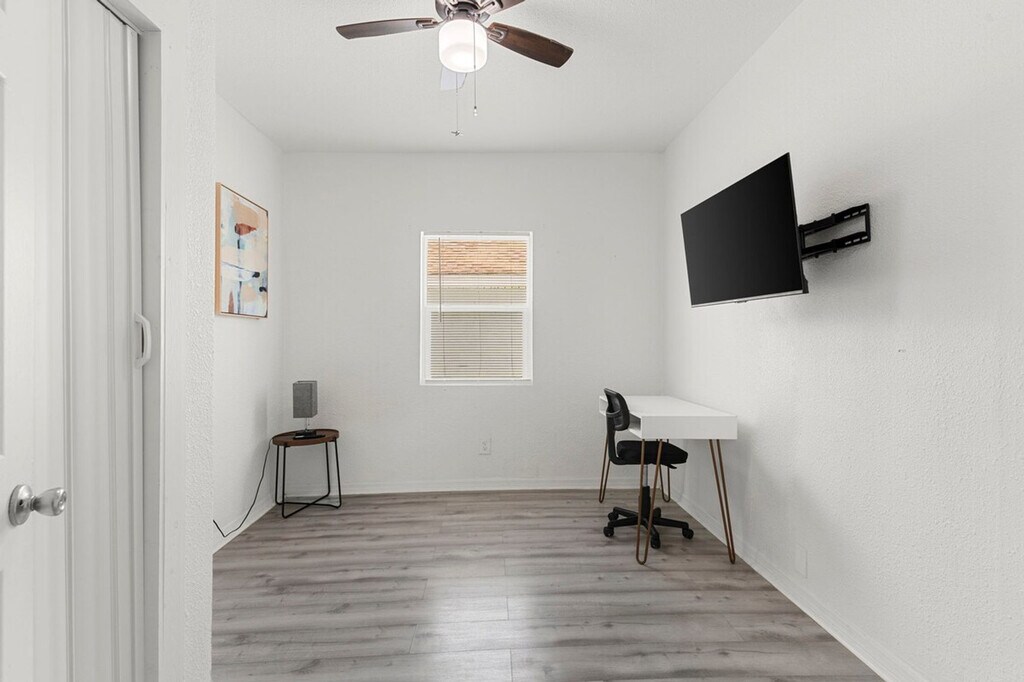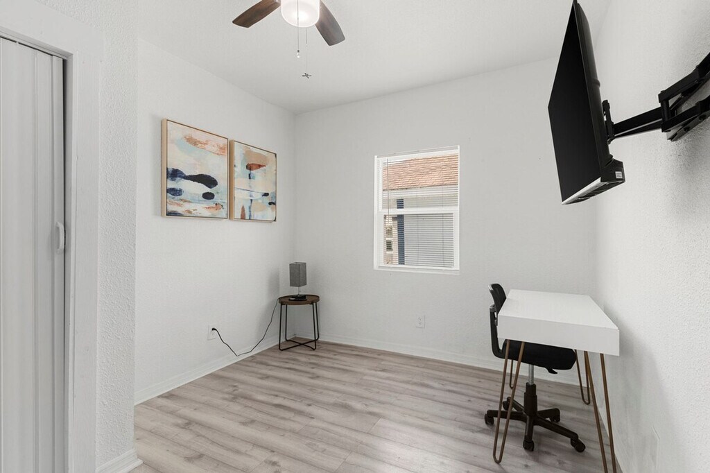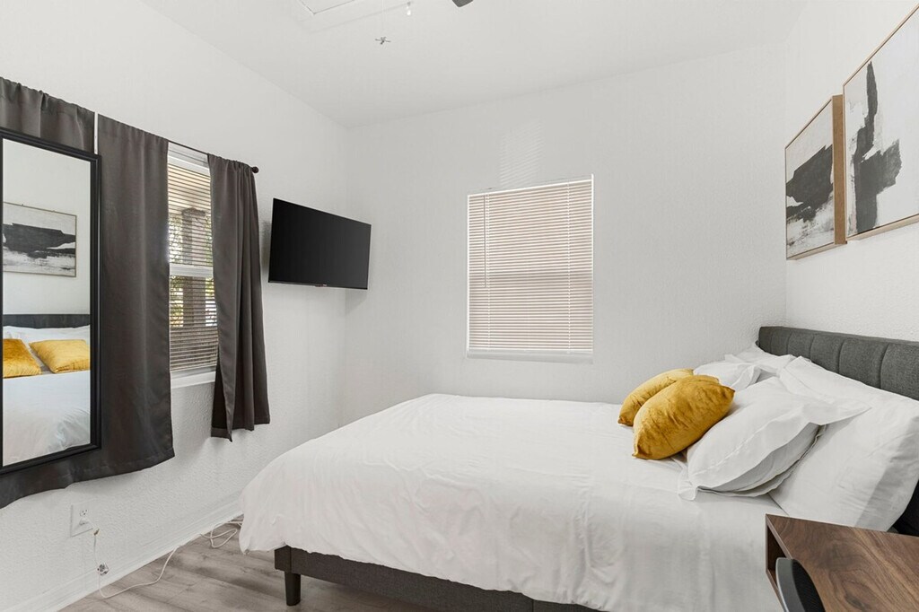 Feel at home in this charming single-story apartment featuring one bedroom and one bathroom, complete with a king-size and a queen-size bed. Enjoy the convenience of a washer and dryer, a fully equipped kitchen, and a dining set. The apartment also offers three smart TVs, desks and chairs in each bedroom, high-speed Wi-Fi, and blackout curtains for your comfort. With self-check-in, a backyard, and free parking, this pet-friendly apartment ensures a seamless living experience. The kitchen is fully equipped with a full-size fridge, a 4-burner stove, a microwave, an oven, an air fryer, a blender, seasoning, cookware, a coffee maker, and drinking and wine glasses, making it perfect for all your culinary needs. Pets are welcome with a non-refundable fee of $150 per pet. Enjoy the convenience of free parking during your stay. Located just 1 mile from Ybor, 2.4 miles from Armature Works and Downtown Tampa, and 2.5 miles from the Florida Aquarium, this apartment offers easy access to some of Tampa's best attractions. With proximity to hospitals like Tampa General and universities such as the University of Tampa, you'll find everything you need within a short distance. Tampa International Airport is only 7.7 miles away, making travel convenient. The apartment offers self-check-in with a smart lock for your convenience. Smoking and parties are not allowed, ensuring a peaceful environment for all guests. Each bedroom is equipped with a desk and chair, complemented by high-speed Wi-Fi, making it ideal for remote work-friendly living. [SI]