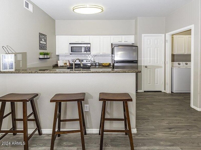 Along the quiet suburban streets of Queen Creek, this property provides the ideal get away with this renovated home and a wide array of upgraded amenities. This 3-bedroom residence is 1180 square feet. This newly redesigned home features a spacious floor plan with hardwood-style floors. Behind a sleek granite breakfast bar, a gourmet kitchen gleams with stainless steel appliances, tile backsplash, brushed nickel fixtures, and white cabinetry. The fully equipped laundry room and elegant bathrooms incorporate the same custom cabinetry, countertops, and fixtures. Bedrooms comfortably accommodate furniture of all sizes and include walk-in closets. A private patio or balcony offers an additional outdoor storage option. USB ports and a Wi-Fi-enabled thermostat.