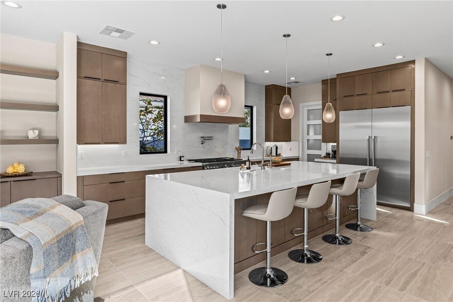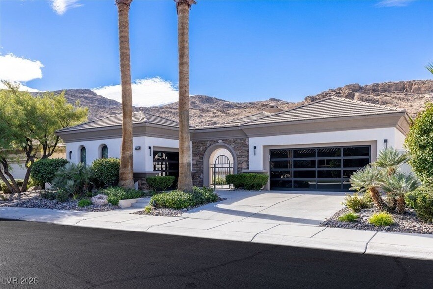 A new sunset. A new view. That s what you ll find every night at this remodeled single-story home in the 24-hour guard-gated community of Red Rock Country Club. Tucked behind a secondary gate in The Vistas, this property backs to nearby mountains, Red Rock ridges, & nothing else but open sky. Completely reimagined in 2024, the interior now showcases large-format tile, modern linear fireplaces, & an open floor plan that celebrates connection. Beyond the oversized glass pivot door, enter the great room where vaulted ceilings, a spacious dining area, & a sleek wet bar make for the perfect place to gather. Anchored by a 66-square-foot waterfall-edge island, the kitchen is the star of the show with quartz countertops & Thermador appliances. Turn on the 75-inch Sony TV in the family room or open the 12-foot glass sliders to enjoy the peace & quiet of the desert. In the backyard, a Pebble Tec lap pool spans almost the entire length of the fence with a massive wet deck & zero-edge spa.