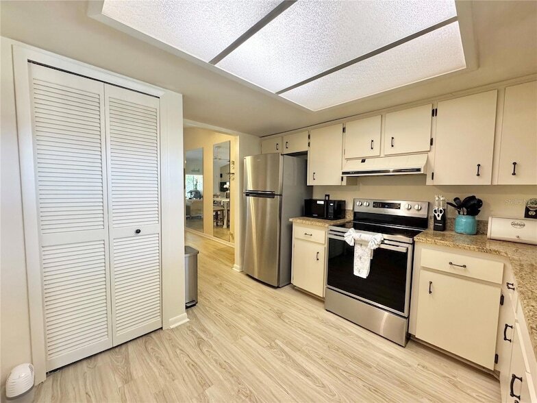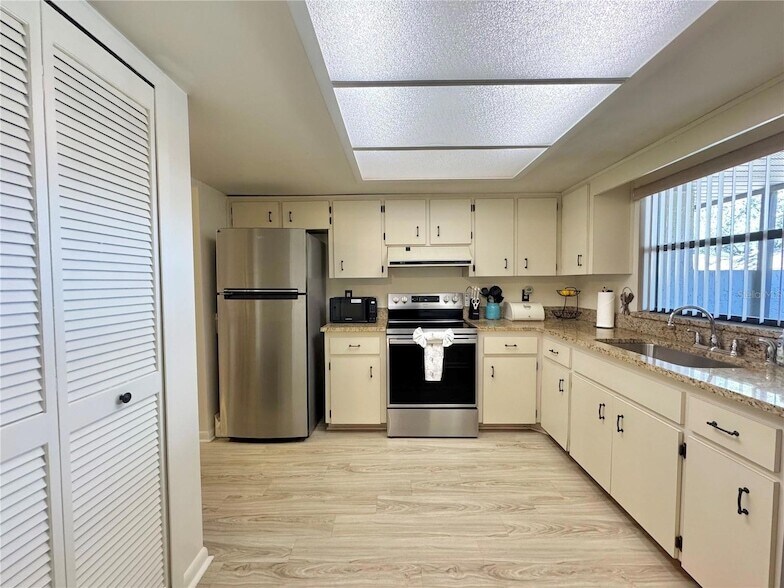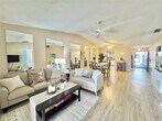 Enjoy golf-community living in this well-maintained Cypresswood villa, perfectly positioned on the 8th hole fairway with serene golf course views from the great room and sunroom. The light-filled sunroom features a wide 6-foot sliding glass door opening, adding flexible living space and flowing seamlessly to the rear open patio. An ideal setting for relaxing and taking in the peaceful backdrop surroundings. Inside, the spacious living and dining areas connect beautifully, creating an inviting space for entertaining or unwinding after a day on the course. Two generously sized bedrooms and two full bathrooms provide comfort and privacy, while the well-appointed kitchen offers granite countertops and ample cabinet space for a clean, updated feel. This inviting home features no carpeting, with easy-care laminate flooring throughout. In addition to the sunroom and rear patio, enjoy a charming front covered courtyard, perfect for morning coffee or greeting guests. Residents of Cypresswood enjoy access to community amenities including a community pool, tennis courts, plus a golf clubhouse with an on-site restaurant and pub, making this a truly social and active lifestyle community! A 24-hour guard-gated entrance provides added peace of mind, and the central location offers convenient access to shopping, dining, and local attractions. Comfort, convenience, and country-club living come together in this wonderful Cypresswood rental ready for you to call home.