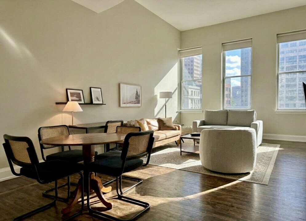 Feel at home in this renovated apartment in Milwaukee's financial district. The historic architecture maintains charm throughout the interior and exterior spaces. This apartment comfortably sleeps six with a queen bed in each of the two bedrooms and a convertible sofa bed in the living room that conveniently folds down into a queen-size bed. Extra pillows and sheets are stocked in the closet, along with a full-size air mattress for a potential 7th guest. High-end amenities include granite countertops, beautiful hardwood floors, and an in-unit washer and dryer. Enjoy the smart TV with Airplay, high-speed Wi-Fi, a kitchen island with barstool seating, and a dining/work table. Reserved parking is not included. For reserved parking, the 500 N Broadway Lot and Huron Garage are the two closest options. Metered street parking is often available throughout the neighborhood and 2-hour time limits apply from 8am-6pm Mon-Fri and 8am-6pm Saturday. All within two blocks you'll find the Third Ward neighborhood, Riverside Theater, Milwaukee Public Market, the Riverwalk, Anodyne Coffee, and countless restaurants and bars. Overnight street parking is prohibited from December 1st to March 1st. Loading zones are often available directly outside the building. Only one set of keys will be provided, so it's extremely important to handle them carefully as the apartment door locks automatically, copies are very difficult to obtain, and lockout fees of $180 will be passed on if incurred. The bedroom has roller shades, however guests can expect some morning light to filter through the windows. For most people this won't be a problem but light sleepers may want to bring an eye mask. This apartment is in a building where weddings are occasionally held on various Friday or Saturday nights during the summer, and music can be heard from the DJ's music, which ends at 12am sharp and should not be very loud inside the apartment itself. No smoking of any kind is allowed anywhere on the premises including outdoor spaces ($150 fine will be assessed and additional fees for remediation may apply). Guests must cover the cost to replace unreturned access devices such as keys, key cards, fobs, or parking passes. Lockouts will result in a $180 fee per occurrence. Quiet time is after 10pm. Includes a dedicated workspace. [SI]