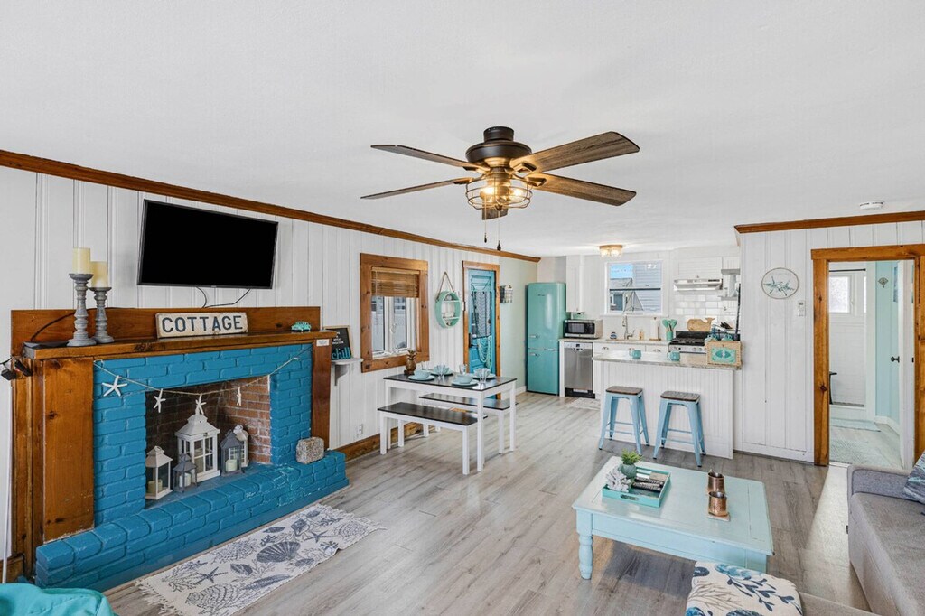 The advertised rate of $7,558/month is the lowest available price, based on a 1 month(s) stay with a move-in date of September 28, 2026. Rates vary depending on the duration of stay, season, and other parameters. For exact pricing and additional pricing components, please visit our website and enter your desired move-in and move-out dates. The rate is applicable when billed upfront; it can be higher if billed in multiple payments. Welcome to Blue Chill Cottage, a mobility-friendly, 1-story, 2-bedroom home on the scenic seacoast where you can feel at home! This enchanting 750 sq. ft. haven is your ticket to the coveted Hampton lifestyle. With few stairs (6 or less) to enter, this home is filled with natural light and a refreshing coastal palette that instantly lifts your spirits. The heart of this home is the open-concept living area, where the kitchen seamlessly blends with the living room. Picture yourself preparing gourmet meals in the stunning kitchen, complete with sleek white cabinetry, high-end appliances, and a charming retro-style refrigerator that adds a pop of personality. The adjacent living space is perfect for entertaining, with comfortable seating and beachy decor that sets the mood for relaxation. Both bedrooms are thoughtfully designed to provide serene retreats after long days at the beach. The primary bedroom, a generous 100 sq. ft., boasts soothing blue hues and ample natural light, creating a peaceful oasis. The bathroom is a vision of coastal elegance, featuring a clean, crisp design with modern fixtures and subtle beach-inspired accents. Throughout the cottage, you'll find delightful touches that bring the beach indoors, from the surfboard wall art to the fishnet decorations and starfish pillows. The light wood flooring throughout adds warmth and ties the coastal theme together beautifully. Energy-efficient ceiling fans and plenty of windows ensure the space stays cool and breezy, embodying the laid-back beach lifestyle. Grill, dine, or just enjoy summer stars from your private back deck. The spacious deck has a large gas grill and dining table that comfortably seats 6. Each property features a starter set of supplies for guests which includes toilet paper, paper towels, dish detergent, and hand soap. The beds are fully made and ready for your arrival with freshly laundered linens. A set of towels for each registered guest is included in the rental rate. This home is considered mobility friendly, because it meets the following criteria: one-floor living is possible, with at least 1 bedroom and 1 full bath on the main living level; few stairs (6 or less) to enter the main living level; and easy access bathing with either a walk-in shower or grab bar to assist with entering a tub/shower combination. Blue Chill provides high-speed internet services and has a Keurig coffee maker that uses K-cups for coffee, tea, and cocoa. For family-friendly homes, a luxury Pack-n-Play or other children's furnishings are available for an additional charge, as availability permits. Blue Chill offers 2 tandem spots in the driveway along the left side of the house. Located in the heart of Hampton, this property puts you just moments away from pristine beaches, local attractions, and the vibrant community. Hampton Beach is the perfect place for families and friends to create enduring memories. Few beaches rival Hampton for the sheer number and variety of amusements. Hampton is top 3 nationwide for water quality. The waves are tame enough for toddlers, yet energetic enough for teens to boogie board. After a fun-filled beach day, Hampton Beach nightlife exudes enthusiasm: fireworks, free concerts, free movies, and headline acts. The Boardwalk is lined with all of the amusements for a classic beach vacation. Clean, energetic, and gorgeous, Hampton Beach is ideal for family-friendly fun! Smoking or vaping in the home or on the property is strictly prohibited and will result in a fine and immediate eviction. No parties, events, performing artists, or bands are allowed at any time, and these are cause for eviction with no refund. If any damage impacts our ability to offer the home for future guests, you will be held liable. Quiet hours are between 10PM and 8AM. Blue Chill does not host furry family members. Blue Chill is heated and cooled by mini-splits, and each unit has its own remote control. [SI]