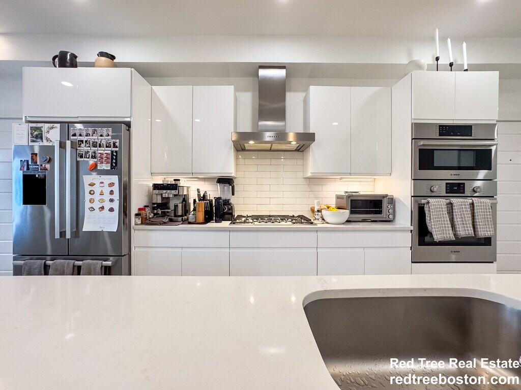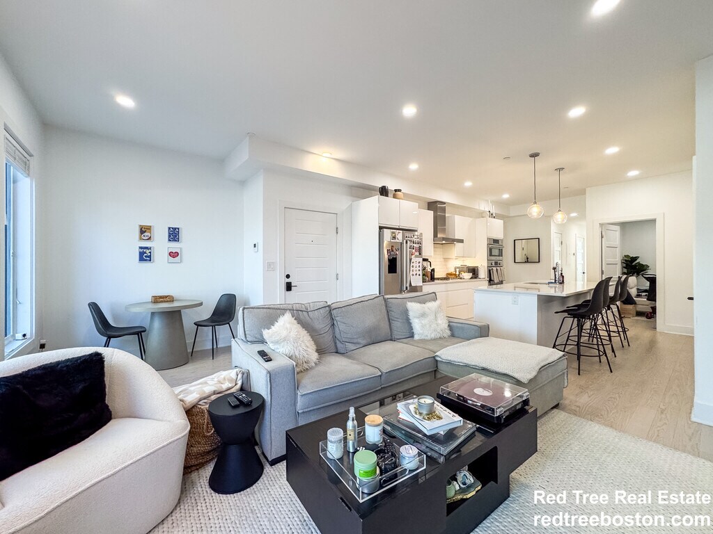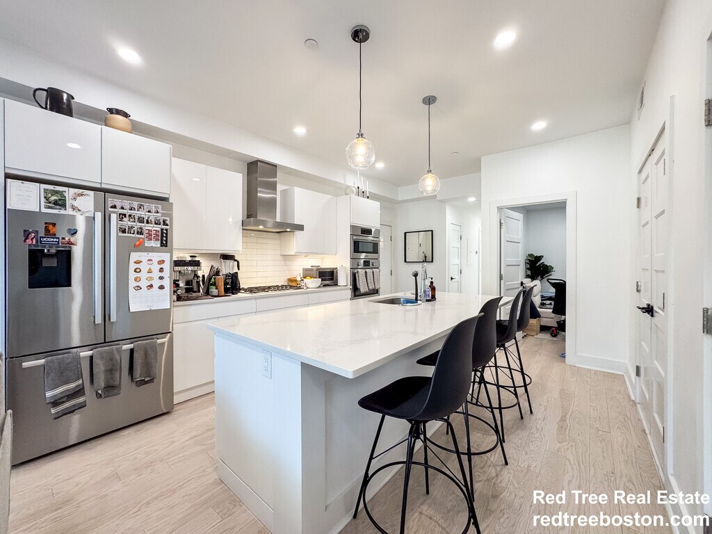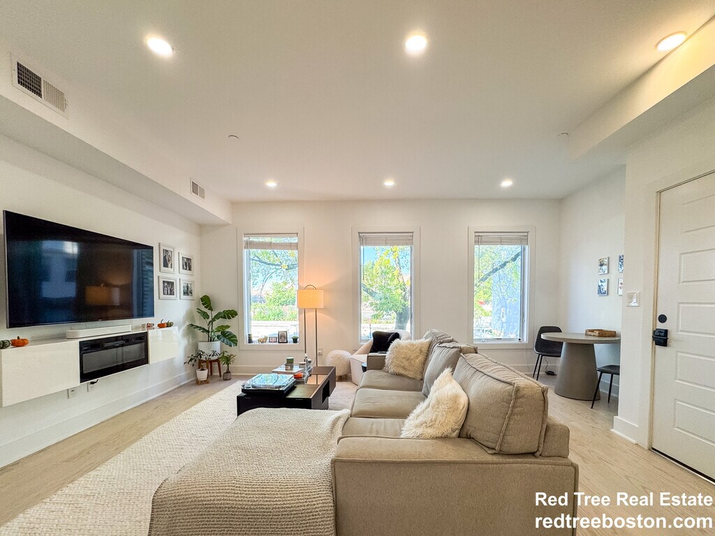 This stunning high-end condo was built in 2021, in East Boston s sought-after Jeffries Point. This second-floor unit features 11 ceilings, large windows, and a spacious open-concept layout with central air, an electric fireplace, and designer finishes throughout. Enjoy a chef s kitchen with quartz waterfall island and premium Bosch appliances. Three bedrooms and two bathrooms, including a primary suite with double vanity, glass-enclosed tiled shower, and walk-out balcony. Garage parking for rent. Prime location: Just blocks from Piers Park, the waterfront, and Harborwalk trails. Quick access to the Maverick T station (Blue Line), East Boston Greenway, local coffee shops, neighborhood favorites like Cunard Tavern and The Quiet Few, and the Seaport via water taxi. Fee Disclosure: First Month Rent: $4,000 Security Deposit: $4,000 Cat Rent: $50 / month Dog Rent: $50 / month Parking Fee: $250 / month (optional)